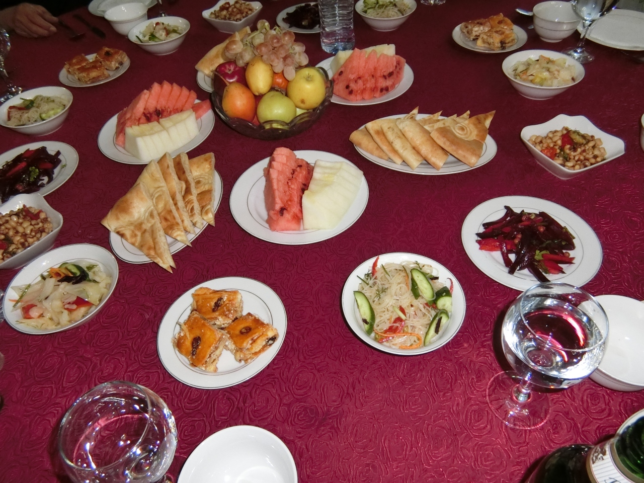 円卓の上には果物、ナン、数種の野菜サラダ、豆料理などが並べてありました。スープの後に出されたメイン料理シュビト・オシュが気に入りました。
