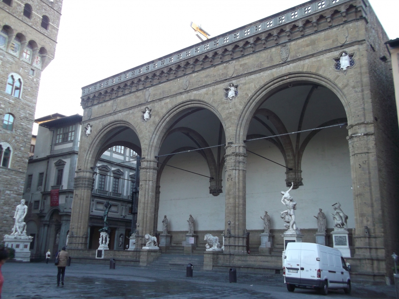 ヴェッキオ宮の前に広がるシニョーリ広場に隣接する、彫刻がズラリと並ぶ回廊です。屋根はありますがその天井が高く、回廊を造るアーチの空間もとても大きいので、まさに野外博物館の様相です。中にも自由に入れるので間近で彫刻を見ることができ、その精密な彫りにも驚かされます。