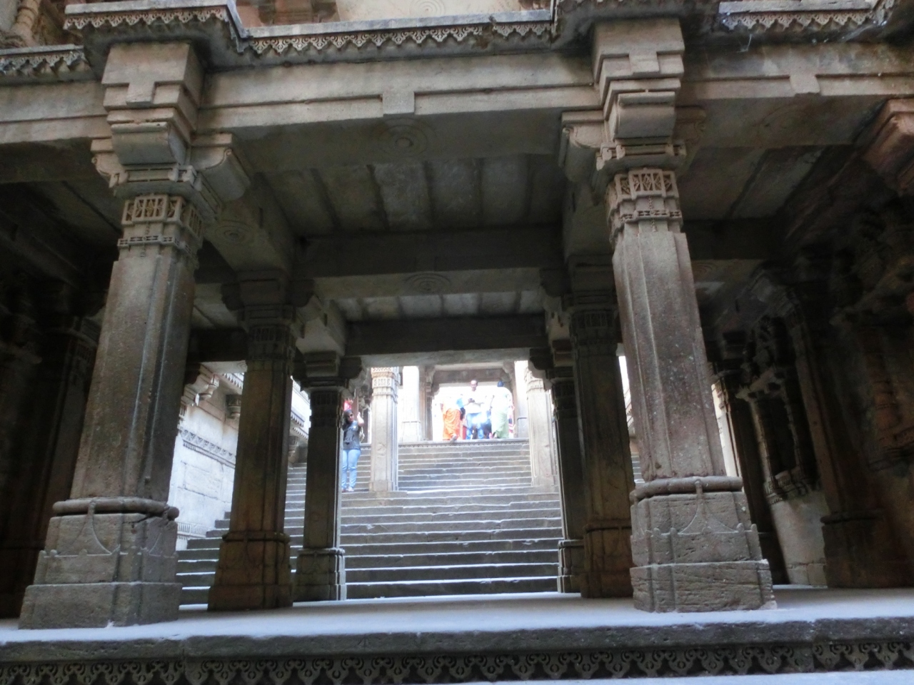 アーメダバード最初の見学は壁のモチーフが素晴らしいアダーラジ階段井戸でした。階段を下りていくと深さ30メートルの井戸がありました。この階段井戸はアーメダバードから近いので子供達も多く来ていて外国人を見ると声を掛けてきました。