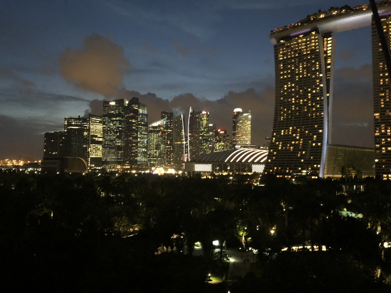 スカイ・ウォークにのぼるには大人8ドルかかりますが、昼間も、夜もなかなかの景色。特に夜は、マリーナ・ベイ・サンズや、シェントン・ウェイの夜景がよく見えます。