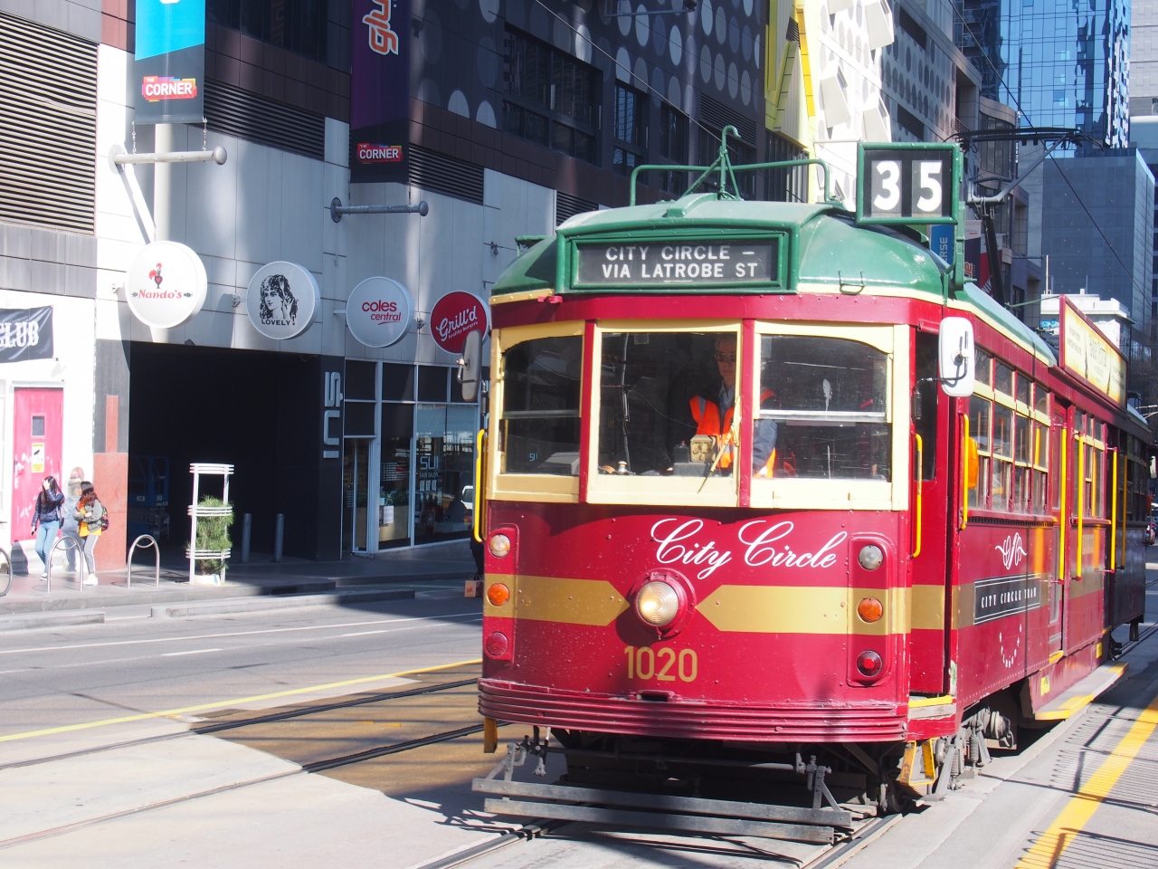 メルボルンのトラムの無料ゾーンの外周に沿って走る35番トラム。どれだけ乗っても無料ゾーン外に出る心配がないので安心して利用することができます。12分間隔で走っていますが、たまにレトロな車体のトラムも走っていました。ただ、古い車体のため車内に電光掲示がなく、観光客にはやや不便だと感じました。