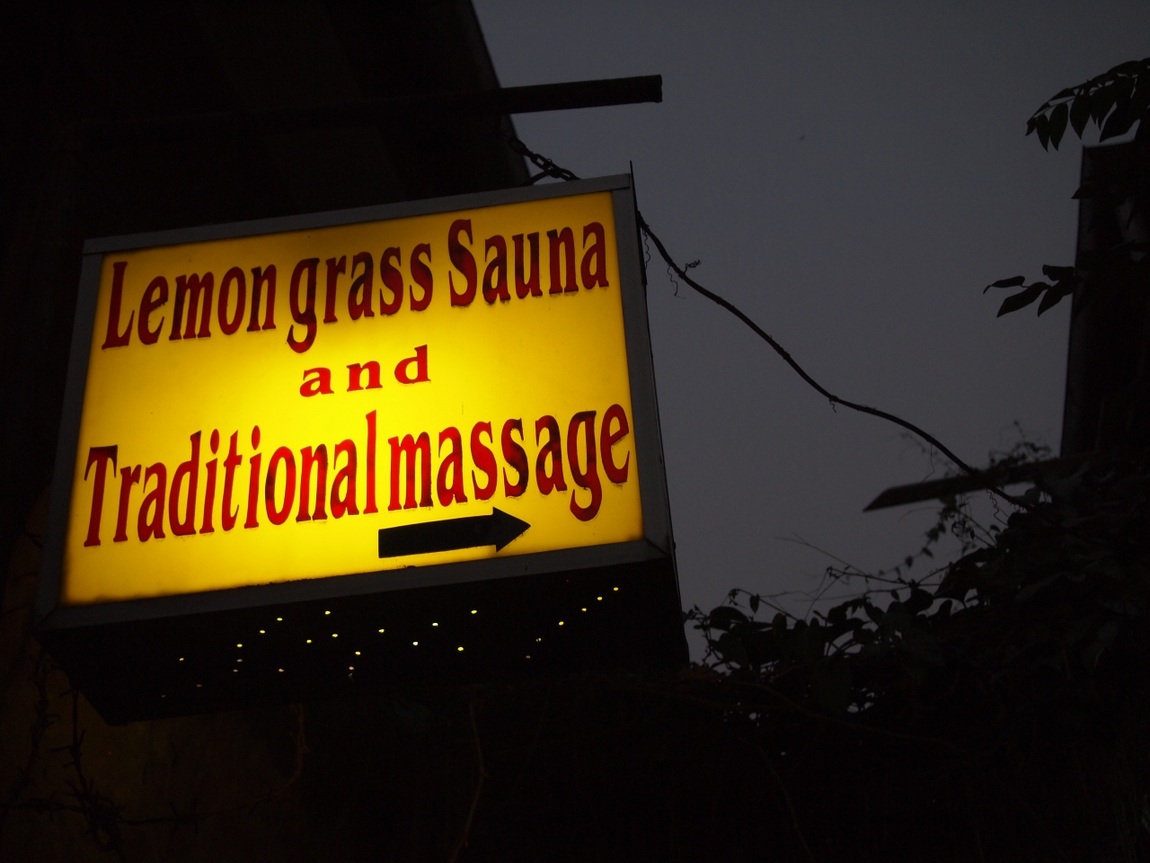 ナイトマーケットで賑わう大通りから一本プーシー側に入った裏通りに佇むレトロなサウナです。大通りにもメニューの看板が出ています。一瞬ここで良いのかとたじろぐ店構えながら、近付くと店の人が「サウナ?」と声をかけてくれました。ビエンチャンのサウナ同様、男女いっしょの利用です。レモングラスの良い香りで満ちたサウナはまさに「箱」といった感で4~5人入れば満員です。お客さんは地元の人が大半、あとは「歩き方」を見て来た日本人がチラホラと。サウナの合間に休憩スペースでハーブティや水は飲み放題、という仕組みもビエンチャンと同じでした。基本的に真っ裸に、入り口で手渡されるバスタオル一枚という心許ない状態なので、油断してタオルが落ちたりしないよう、若干の緊張感がありました。混み合う時間は2か所のシャワールームも行列です。あとに用事がある場合は余裕をもってご利用を。
