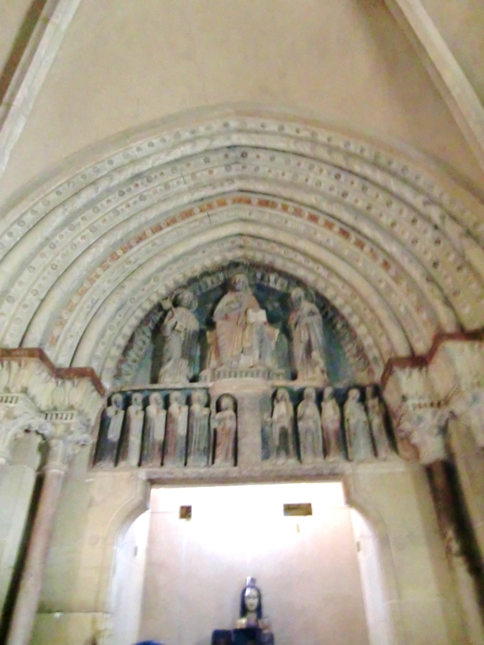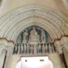 13世紀にゴシック様式で改修された教会ですが、コウノトリの巣と風見鶏が共存している鐘楼部分は、ロマネスク教会時代のものだそうです。中に入ってみると、ロマネスク教会時代の入口が残されています。初めて、彩色されているタンパンを見ました!世界遺産のカテドラルの光のショーなどで、かつてのタンパンの彩色を再現して見せているとの話も聞きますが、こんな小さな村の教会で実際に目にすることができるとは、意外な驚きでした。新築当時の教会は、本当にカラフルな彫刻で飾られていたわけですね。