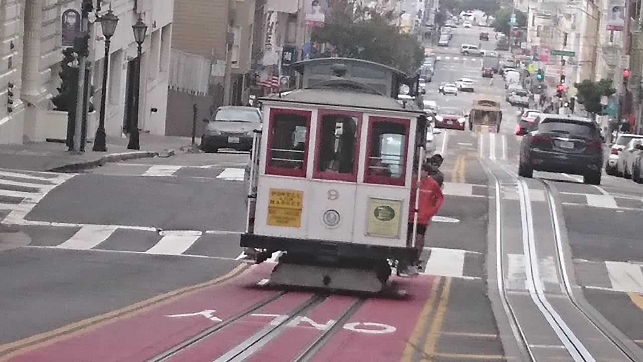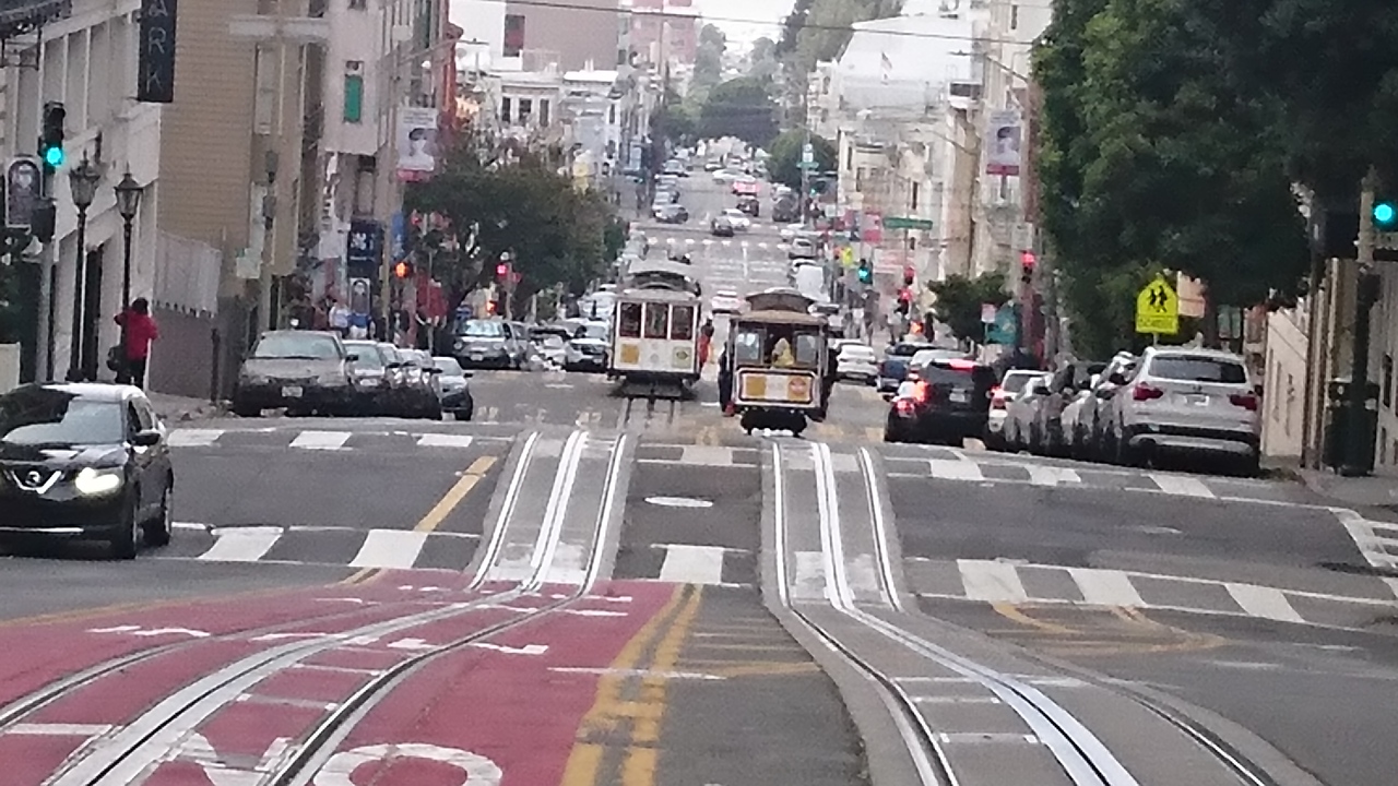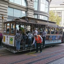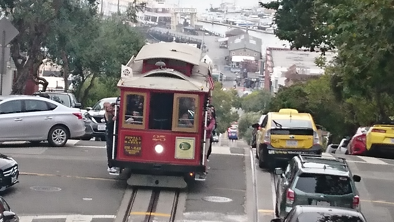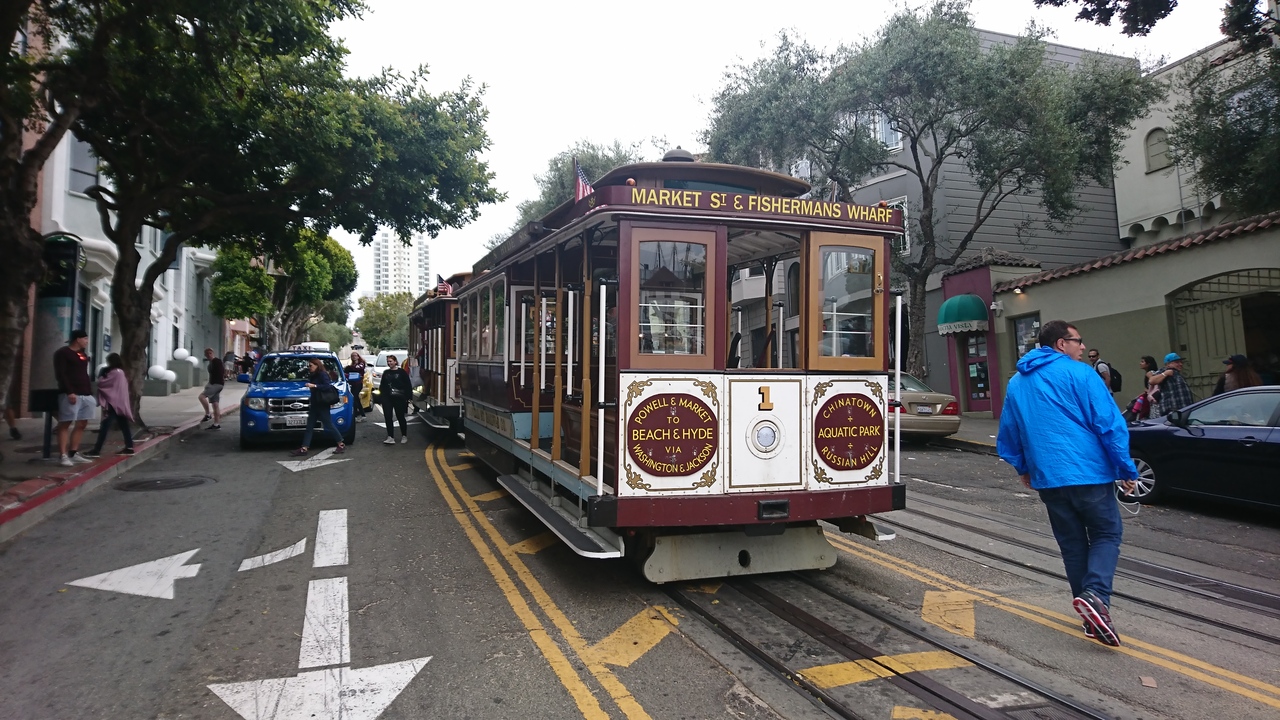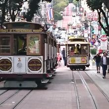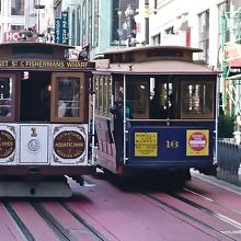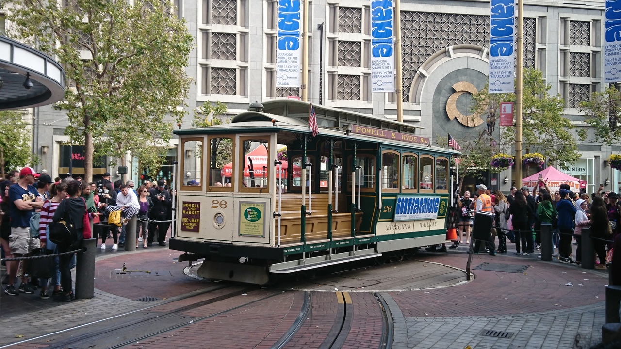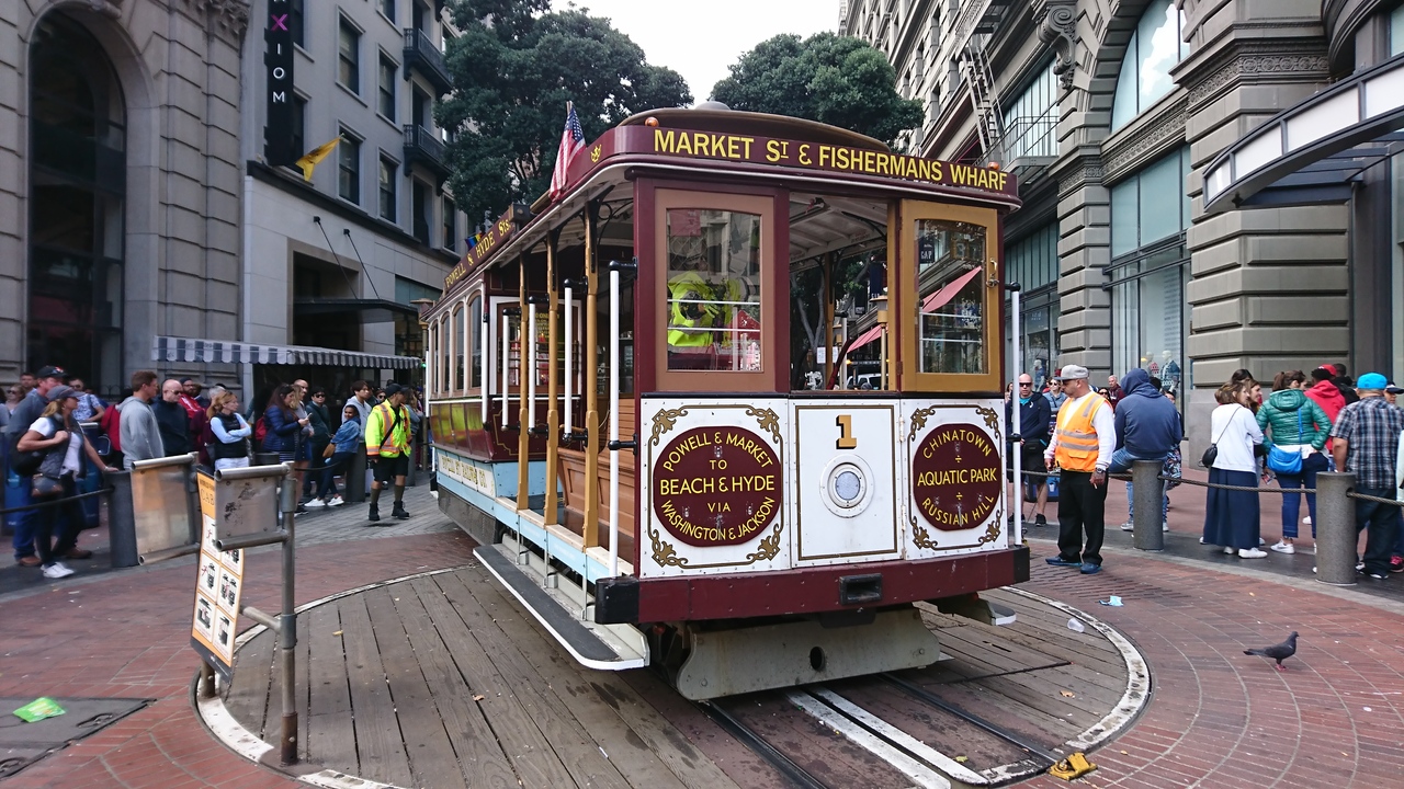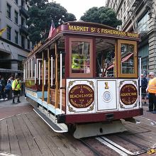サンフランシスコの顔とも言うべき乗り物。これに乗らないと、サンフランシスコに来た気がしないような存在。1873年の開業で住宅地を走りますが、1回の運賃が7ドルすることを考えると完全に観光名所。フィッシャーマンズワーフへ行けるのて観光ルートにも組みやすい。たたし、パウエル駅でかからの乗車は、ケーブルカーの向きの回転を見ることができるので楽しいですが、待ち時間か長いこと必至。シーズンは1時間くらいは並びます。ケーブルカーの醍醐味を味わうには、握り棒に掴まって、風を受けながら乗ること。交差するケーブルカーや路駐の車とすれすれの感じを楽しめるのもケーブルカーだからこそ。また、夜遅くまで走っているので、夜に乗るのも面白いです。