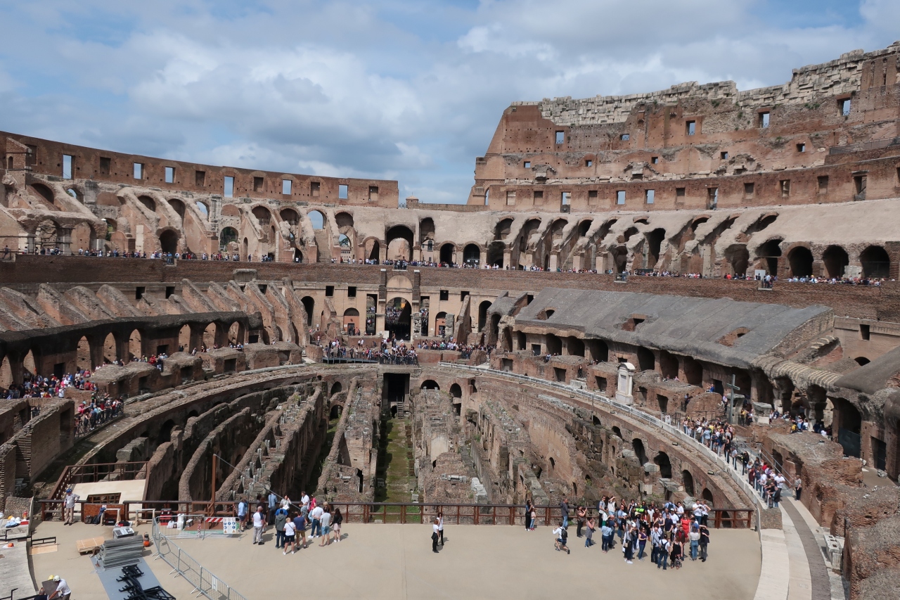地下鉄B線「Colosseo駅」を出ると、目の前に巨大なコロッセオが!。観光客でごった返していました。72時間ローマパスを持っていたので、グループエントランスから入場できました(施設見学2つ無料が付いています)。普通に入場券を購入していたら、長蛇の列に並ぶことになってしまいます。セキュリティチェック後、施設内へ。圧倒的な迫力に興奮間違いなしです。ローマへ行ったなら、ぜひ外側だけでなく内部へ入って見学することをお勧めします。