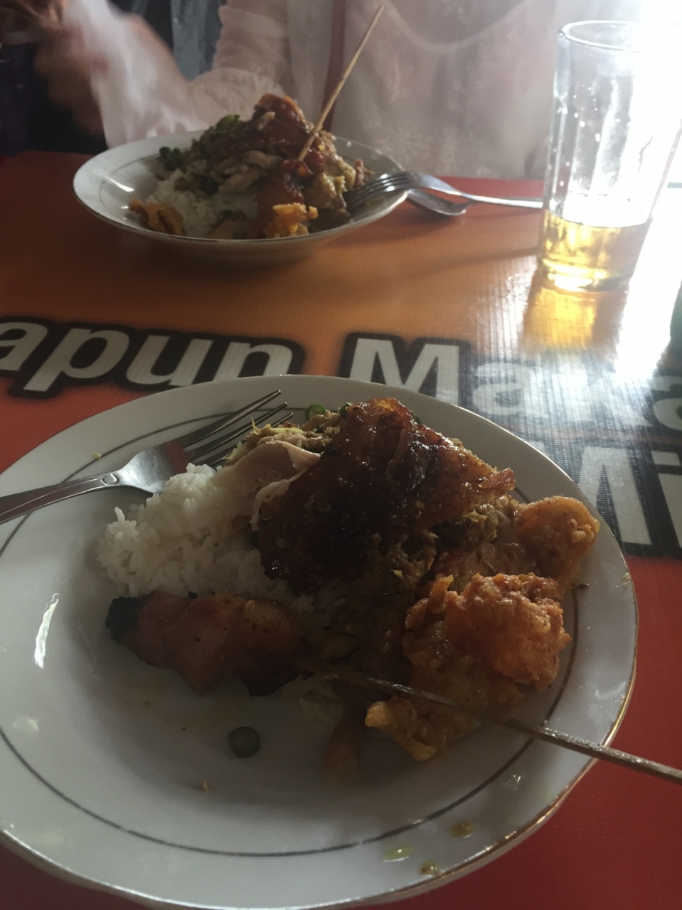 バリコレクションのついでに歩いて行ったら20分以上かかりました。かなりローカルな場所にありますが、かなり混んでました。地元の方と観光客が半々くらい。わけわからず並んでるとテーブルに座らされました。並んでる人はテイクアウトでした。スパイシーでないのを食べましたが、スパイシーで美味しいです。スープも見た目酷いですが、こちらもめちゃ美味です。ビンタンビール大と合わせて10万ルピアでした。