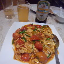 今回はトマトと卵の炒め物でビール、翌日昼食に餃子