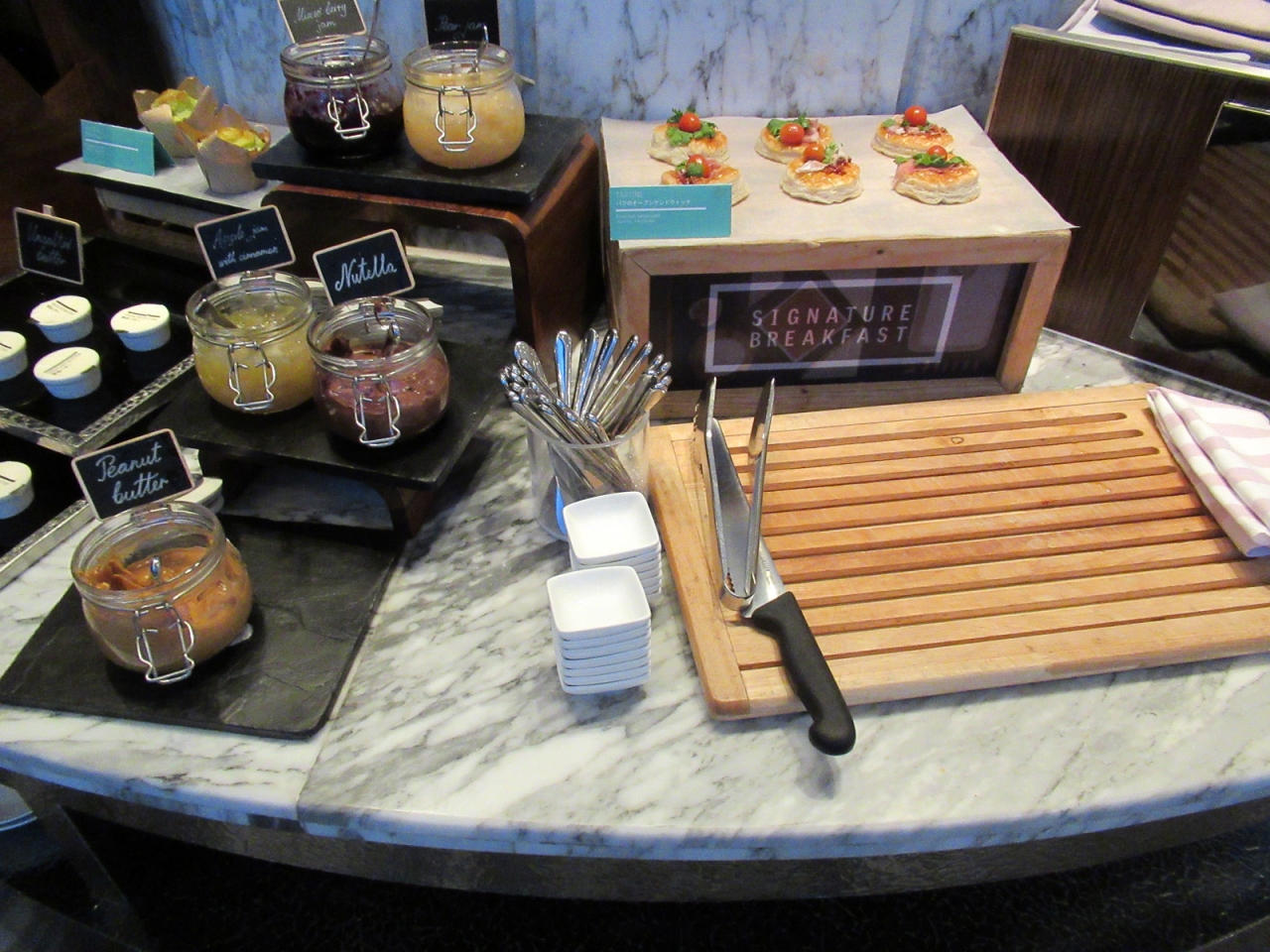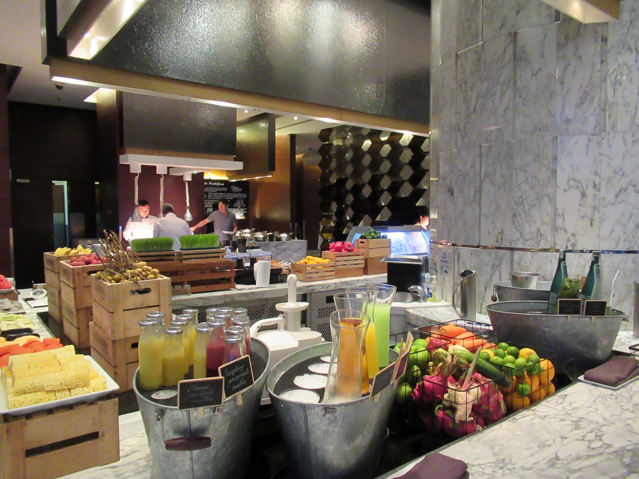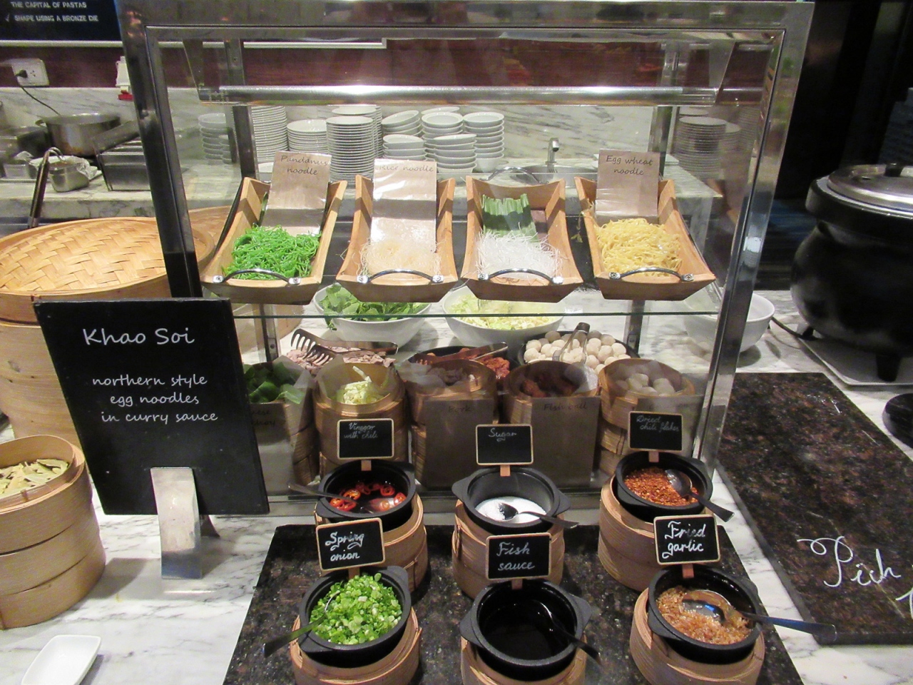 メリディアン・バンコクに宿泊する楽しみの一つが、こちら2階にある「レイテストレシピ」での朝食です。ロビー階から続く吹き抜けの一面はガラス窓、明るい色調の客席もあって、まさに朝食にぴったりの雰囲気です。テーブルに着くと「コーヒーか紅茶はいかが?」と尋ねられますが、こちらのコーヒーは私の大好きなillyですし、カプチーノであろうとカフェラテであろうと自在に注文できるのも良い点です。こちらの朝食の楽しさは、まずは大胆な料理の見せ方です。大きなクロワッサン、ココットに入れられたバター、木箱には果物、サラダの野菜はガラス瓶、ガラスケースにはスムージーやヨーグルト、タイ料理は別スペースと、まるで自分自身が発見相次ぐ探検家になった気分にさせられます。ブッフェカウンター内はライブキッチンにもなっていて、卵料理のバリエーションも豊富ですし、ヌードルバー、カービングサービスなど、人手をかける点はさすがタイです。日本人客を優遇するホテルだけあって、日本食コーナーもあります。