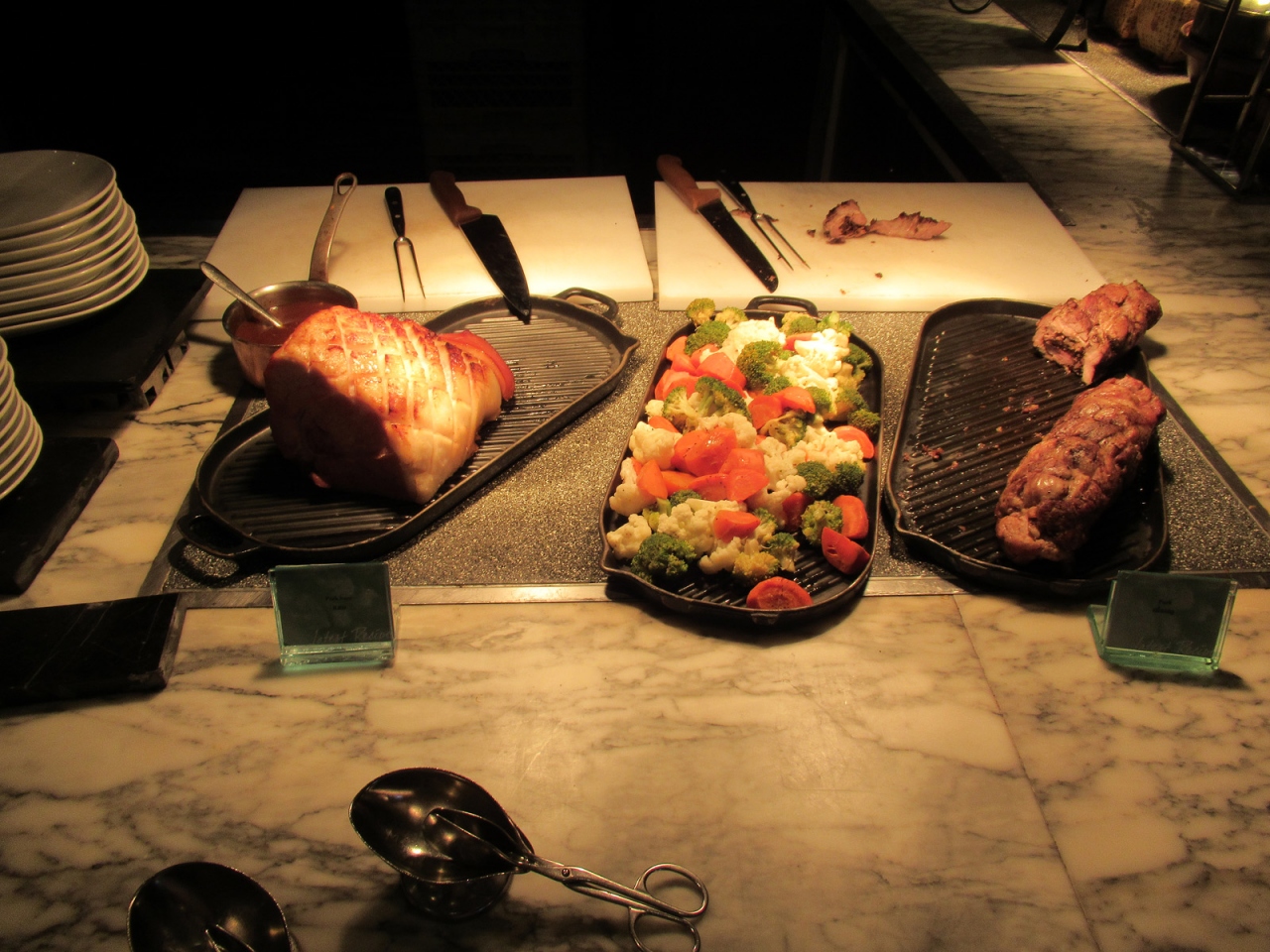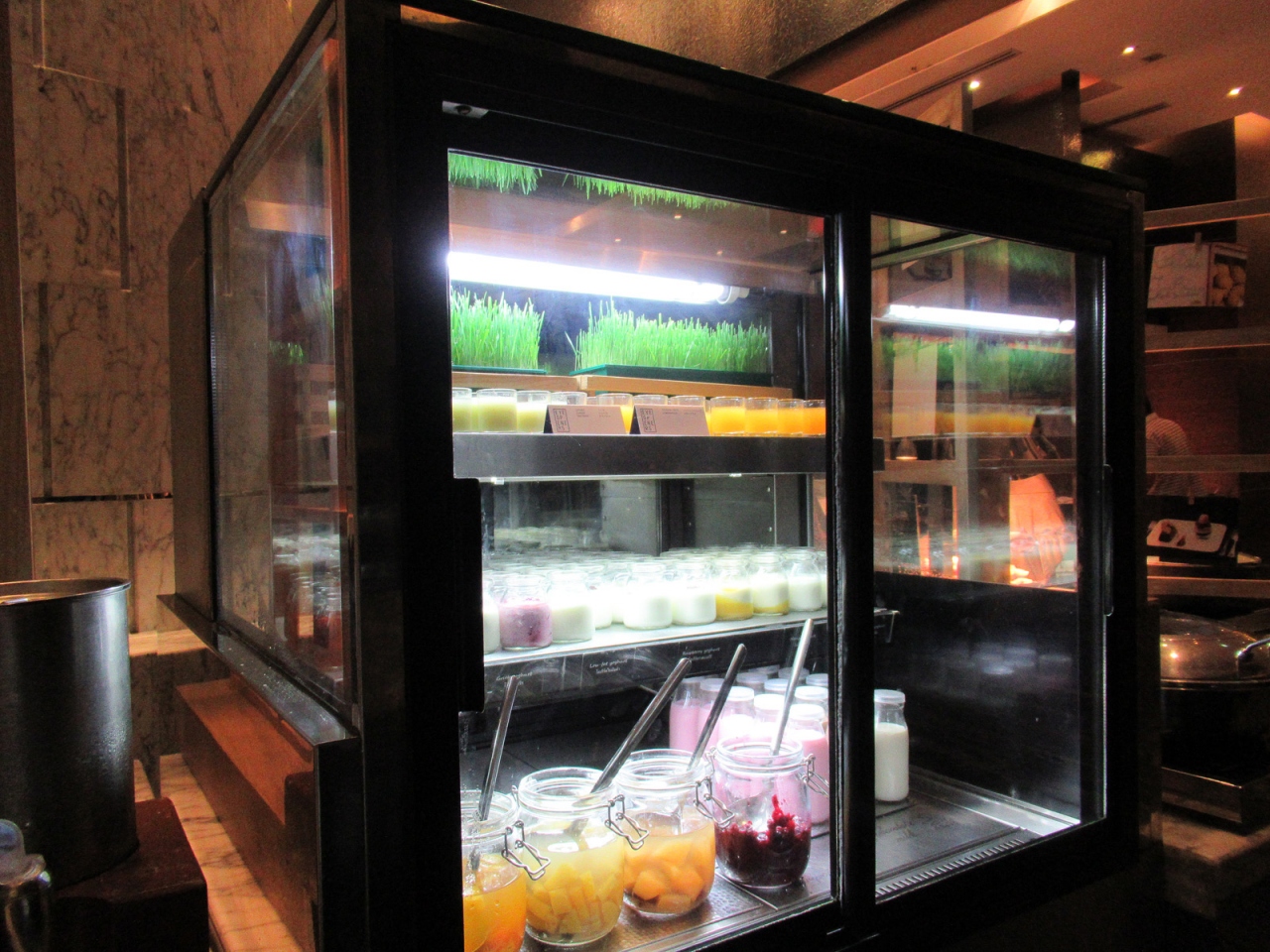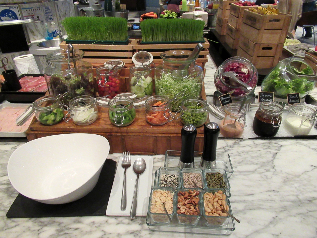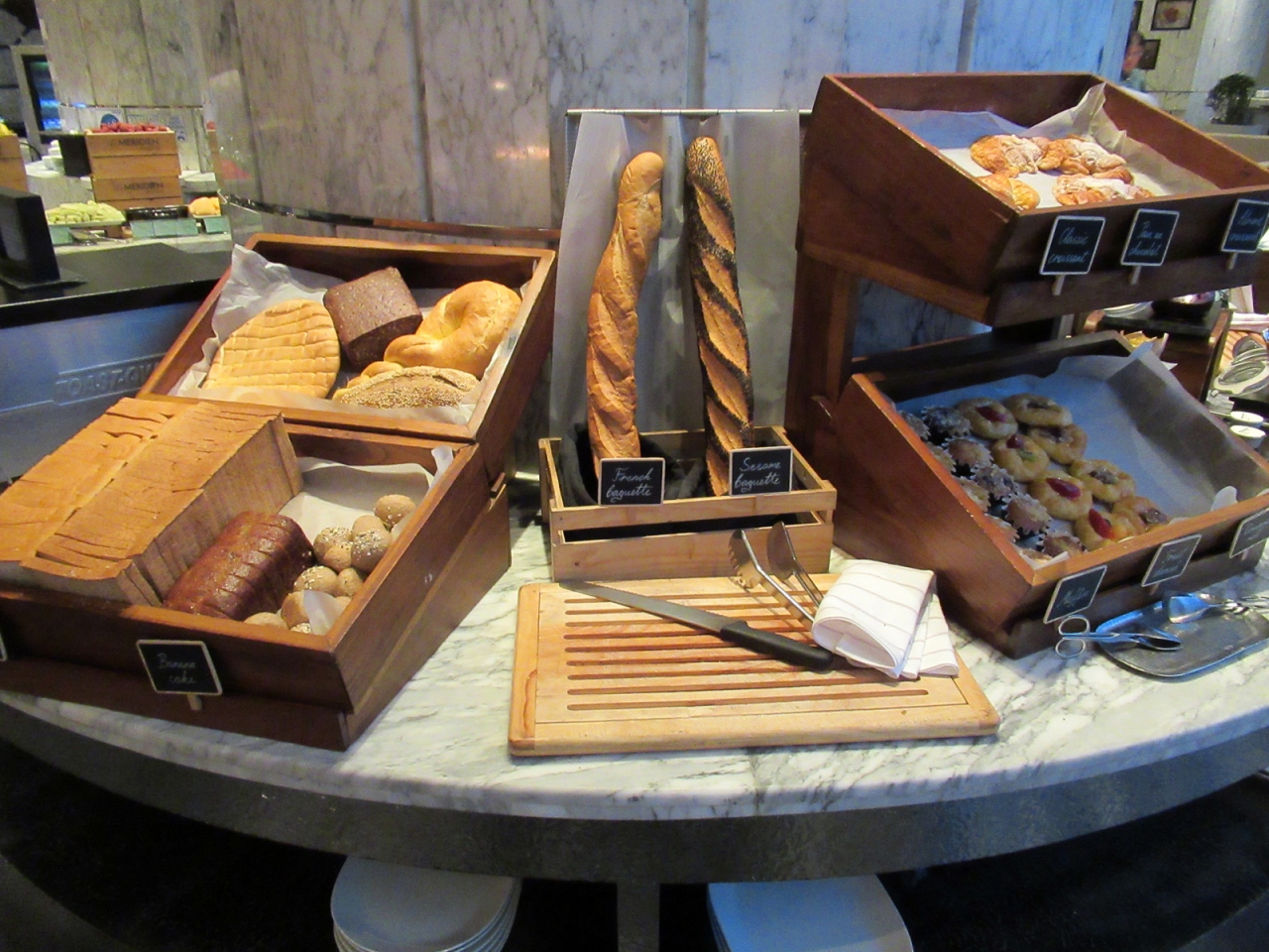 メリディアン・バンコクに宿泊する楽しみの一つが、こちら2階にある「レイテストレシピ」での朝食です。ロビー階から続く吹き抜けの一面はガラス窓、明るい色調の客席もあって、まさに朝食にぴったりの雰囲気です。テーブルに着くと「コーヒーか紅茶はいかが?」と尋ねられますが、こちらのコーヒーは私の大好きなillyですし、カプチーノであろうとカフェラテであろうと自在に注文できるのも良い点です。こちらの朝食の楽しさは、まずは大胆な料理の見せ方です。大きなクロワッサン、ココットに入れられたバター、木箱には果物、サラダの野菜はガラス瓶、ガラスケースにはスムージーやヨーグルト、タイ料理は別スペースと、まるで自分自身が発見相次ぐ探検家になった気分にさせられます。ブッフェカウンター内はライブキッチンにもなっていて、卵料理のバリエーションも豊富ですし、ヌードルバー、カービングサービスなど、人手をかける点はさすがタイです。日本人客を優遇するホテルだけあって、日本食コーナーもあります。