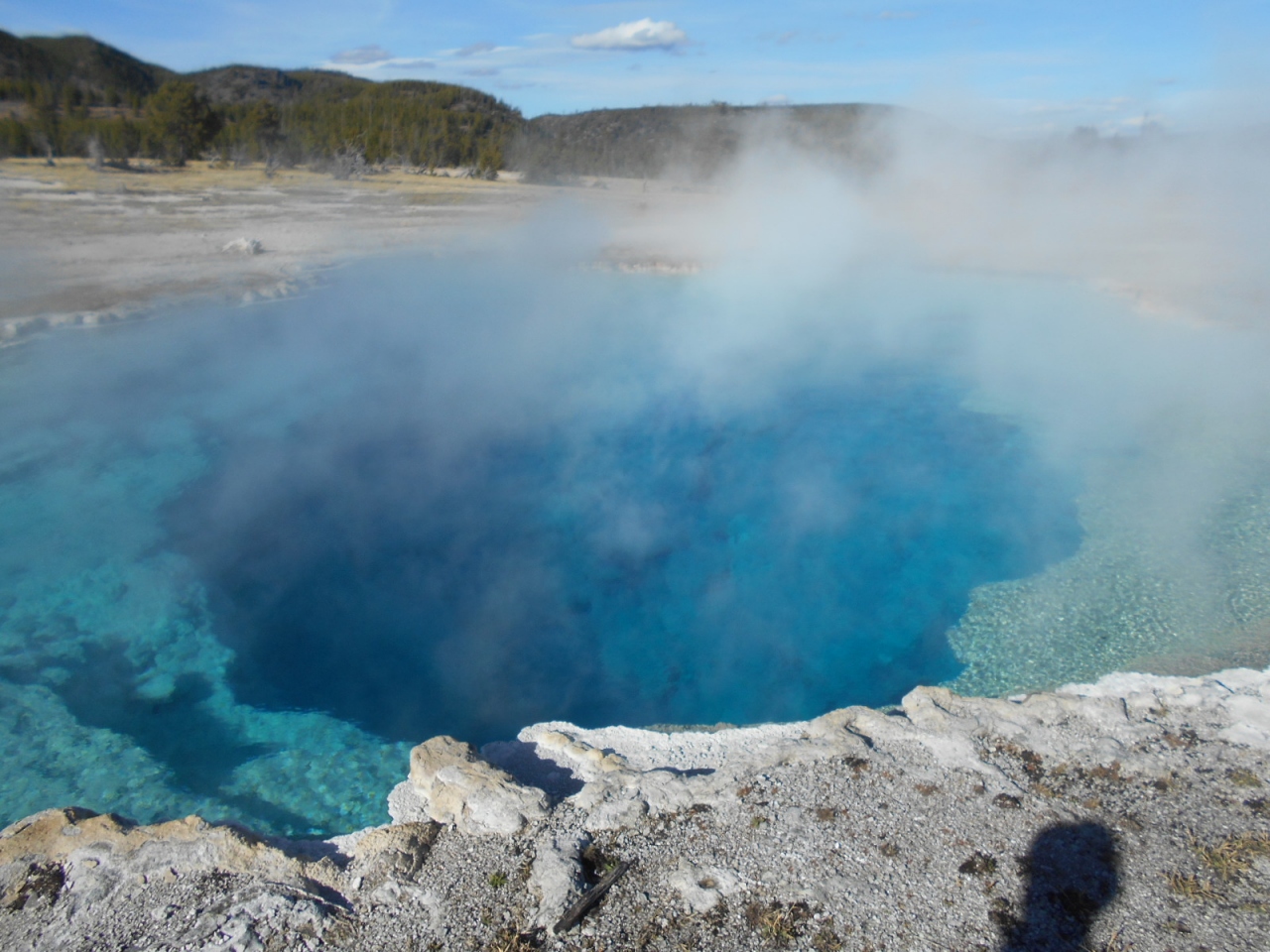 その代表的なものが、オールド・フェイスフル・カイザー間欠泉。青空をバックに、冷たい空気を割いての蒸気は、一層見ごたえがある。ほぼ正確に噴出するので、見やすい。