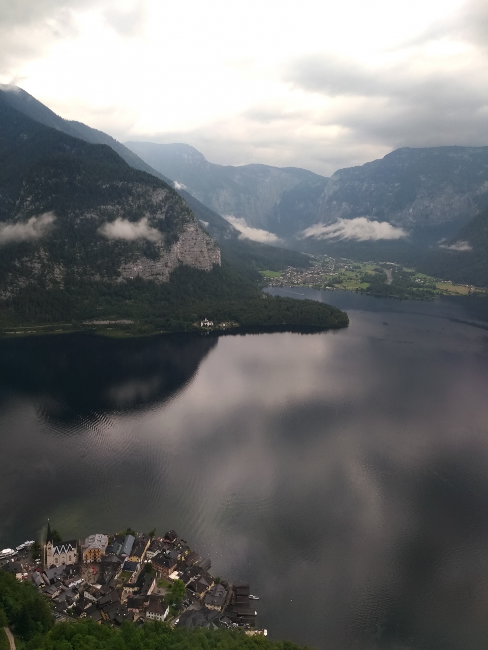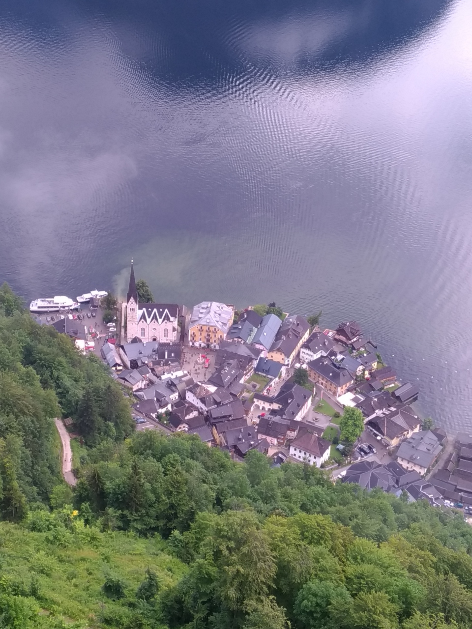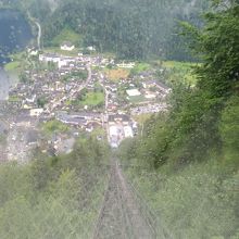 Hallstatt Skywalk "Welterbeblick"に行きます。ケーブルカーの駅を出て、右下の道を進み、山肌沿いの歩道を歩くと、先端が三角形の展望台が見えました。