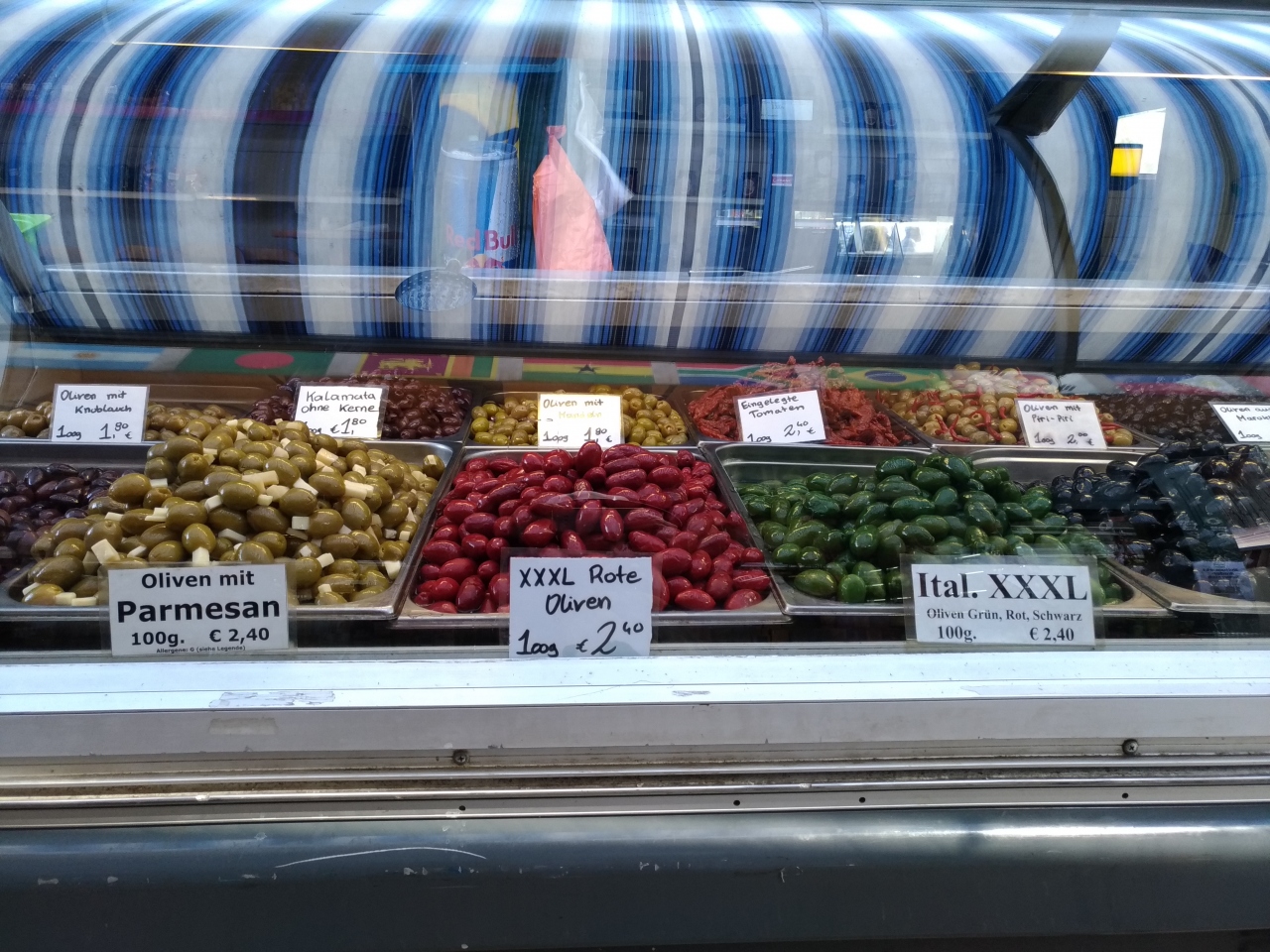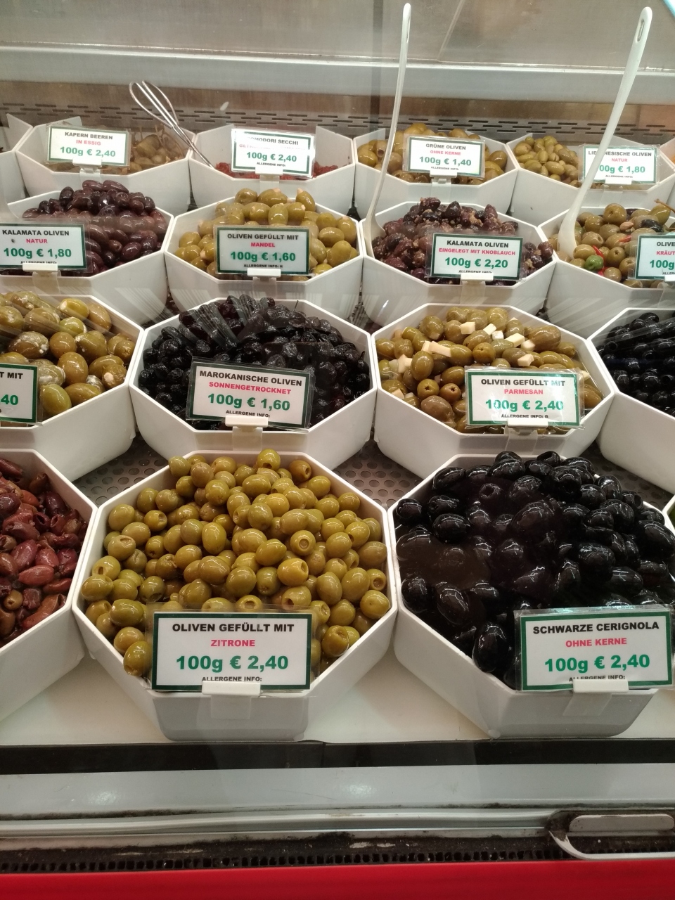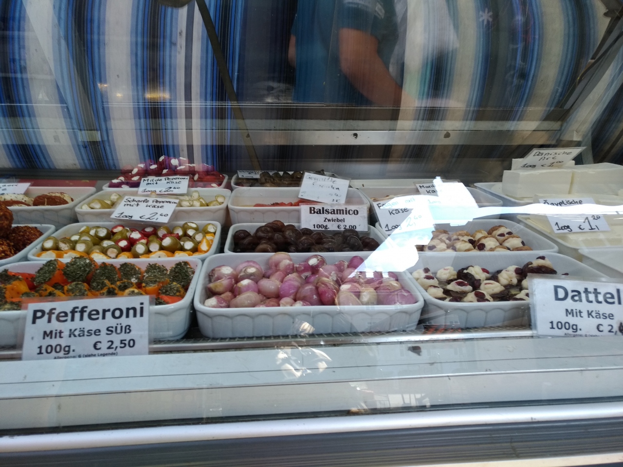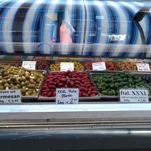 マジョリカハウス、メダイヨンマンションを見に行き、ここを通ってそのままオペラまで歩いていきました。野菜、果物、肉等の他に、フォアグラ専門店や香辛料の店が並んでいます。スタッフドオリーブがいろいろ並んで、とても綺麗でした。1個ずつ買って食べたいと思いました。見ているだけで楽しい通りです。午前中の空いている時間だったので、スリなどの心配も無く歩きました。