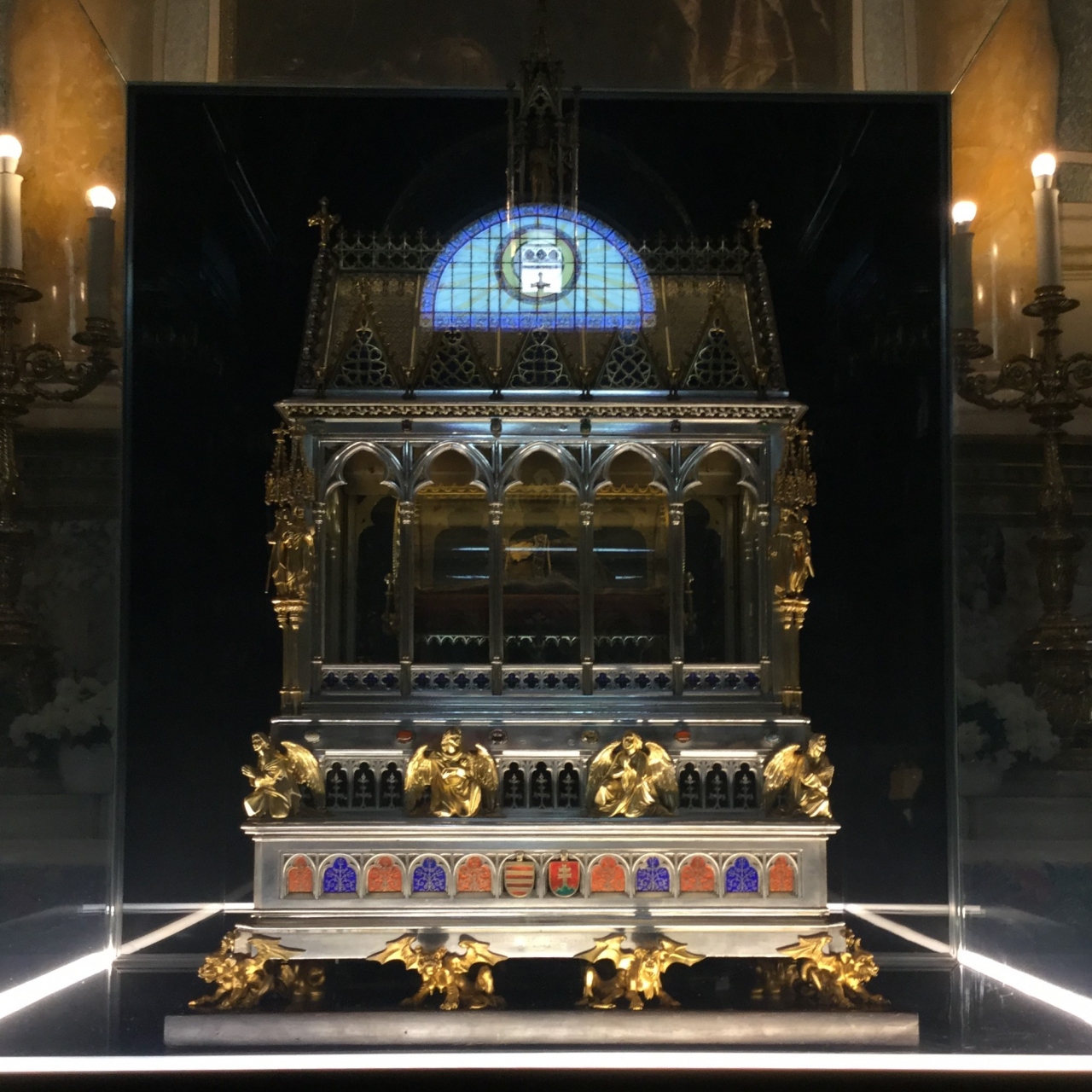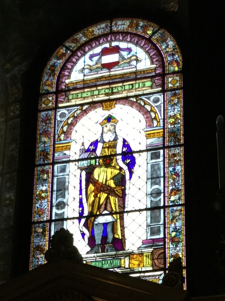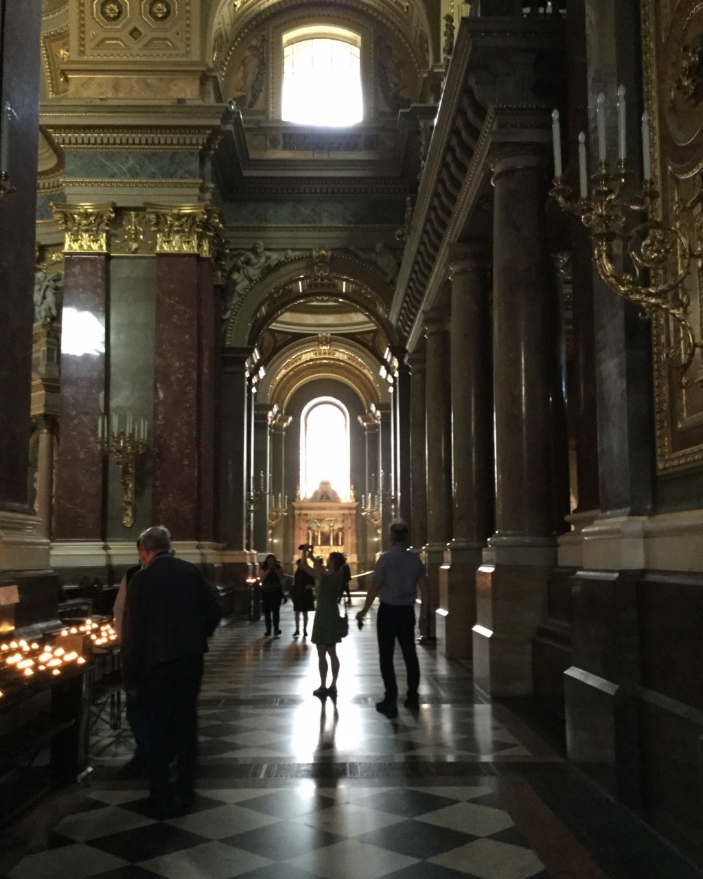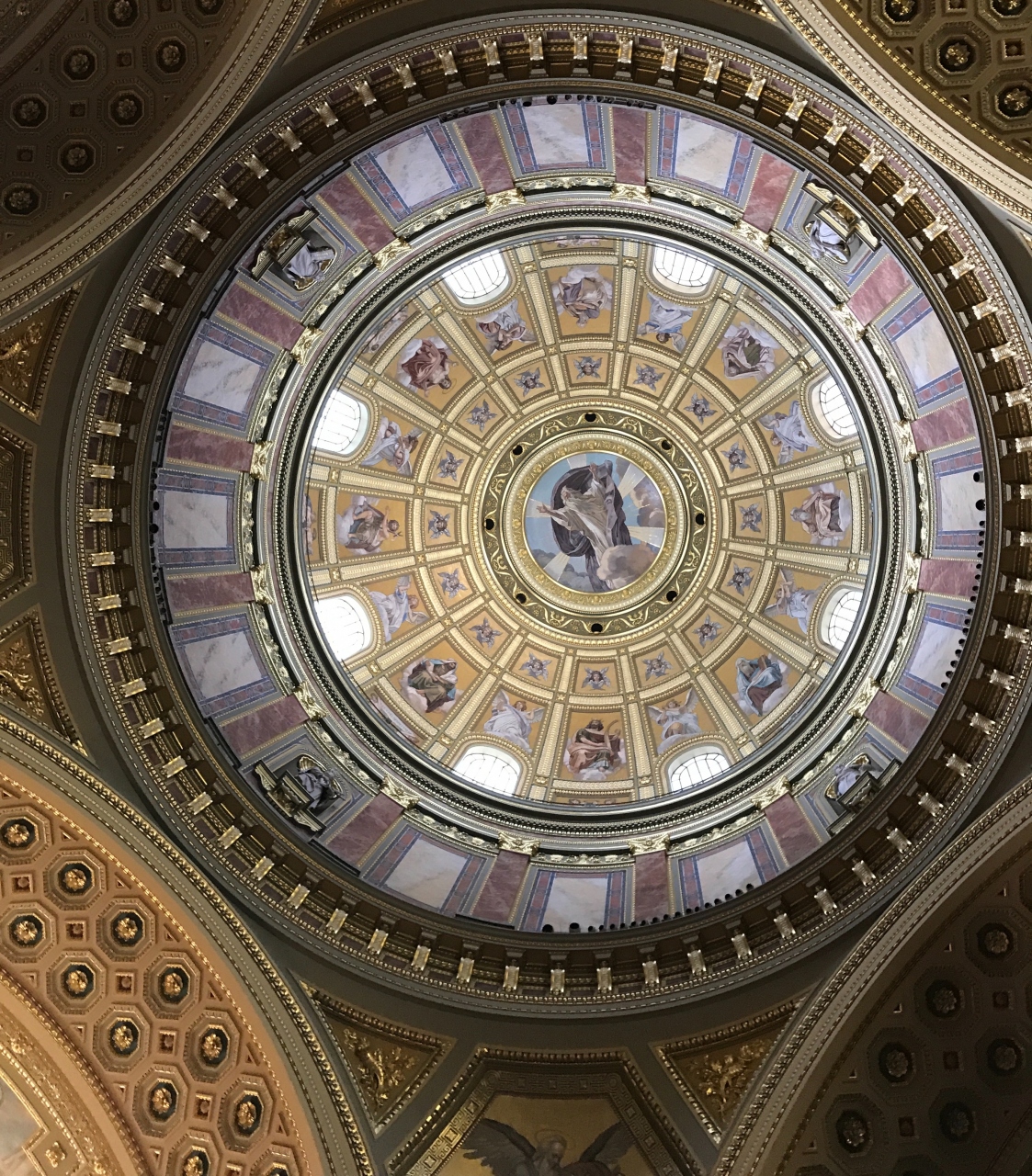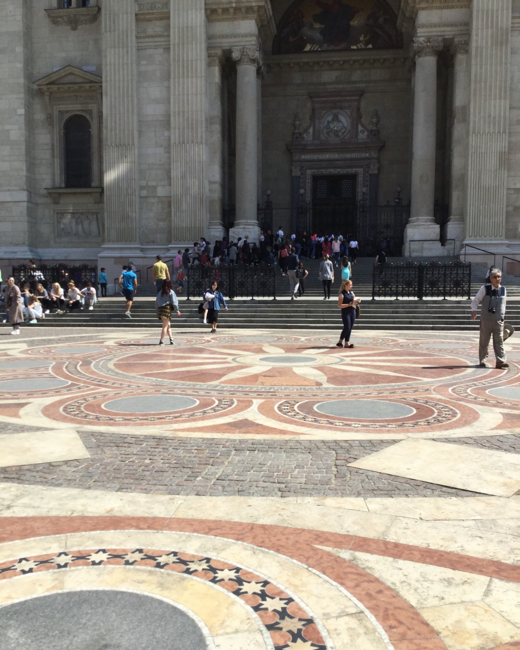 ハンガリー建国の父イシュトバーンの大聖堂。聖堂内は聖遺物のイシュトバーンの右手のミイラをはじめとしてイシュトバーンゆかりのものが多くみられます。必見は小窓を配した青いドーム天井とイシュトバーンや王冠などの美しいステンドグラスですが、聖堂前広場の石畳のモザイク模様もお洒落でとても綺麗でした。