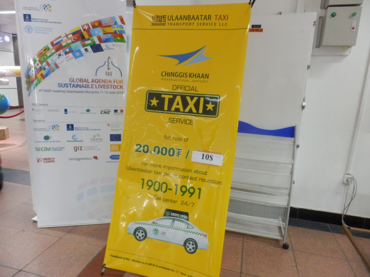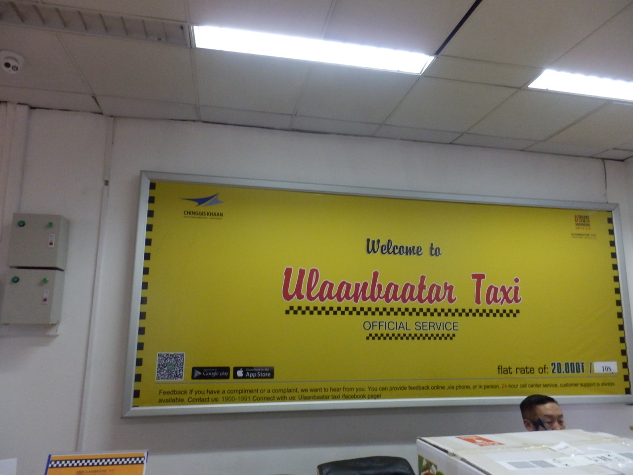 空港の出口に正規らしきタクシーサービスがありました。料金は一律で、2万トゥグルグ、あるいは10USドルでした。空港に着いたばかりでよく分からなかったので利用しました。カウンターの女性は英語可で、一律料金でしたので安心でした。