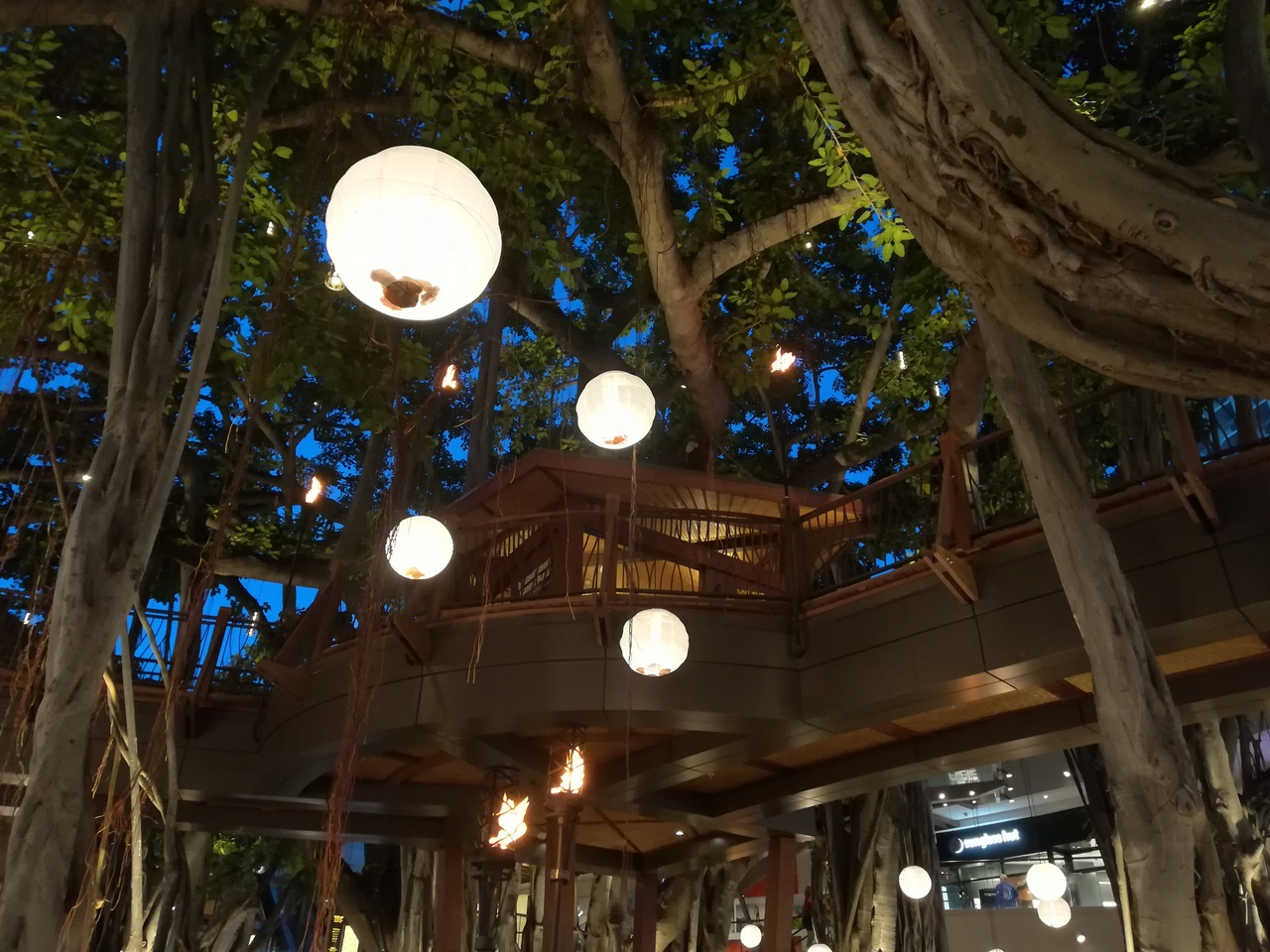 開放的なショッピングモールで、吹き抜けに大きなバニヤンツリーがドンとそびえてます。撮影スポットにはイスも置いてあり、夜には幻想的な写真が撮れます。