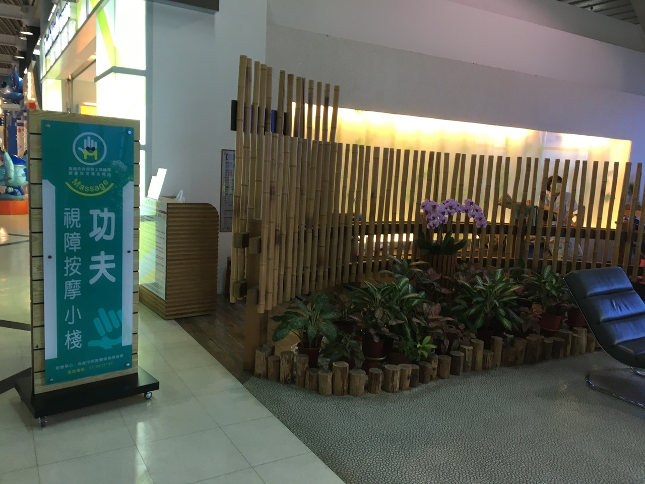 国際線の出国検査を出ると、左右にコンコ一スに行く通路があるだけのコンパクトな空港です。ピーチに乗るために、検査後に右側の通路に進みました。売店以外に時間を過ごせそうなところを探すと、コンコ一スの先あたりには、マッサージ店がありました。10分からできました。