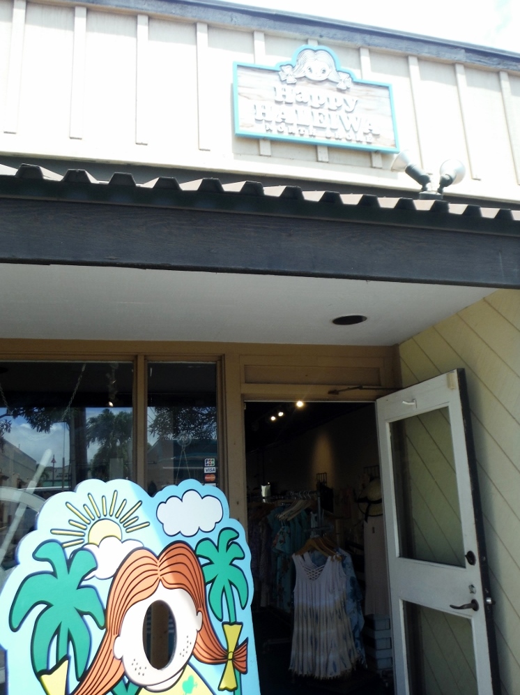 ハレイワオールドタウンを歩いていると「ハッピーハレイワ」の前に大きな顔出しパネルが!顔の中に顔を出す感じで写してみると変でしたが、キャラクターのハッピーちゃんは可愛い。どこかでみた事があるハッピーちゃん。Tシャツだけかと思っていたら雑貨も可愛い。これもハワイ効果でしょうか。