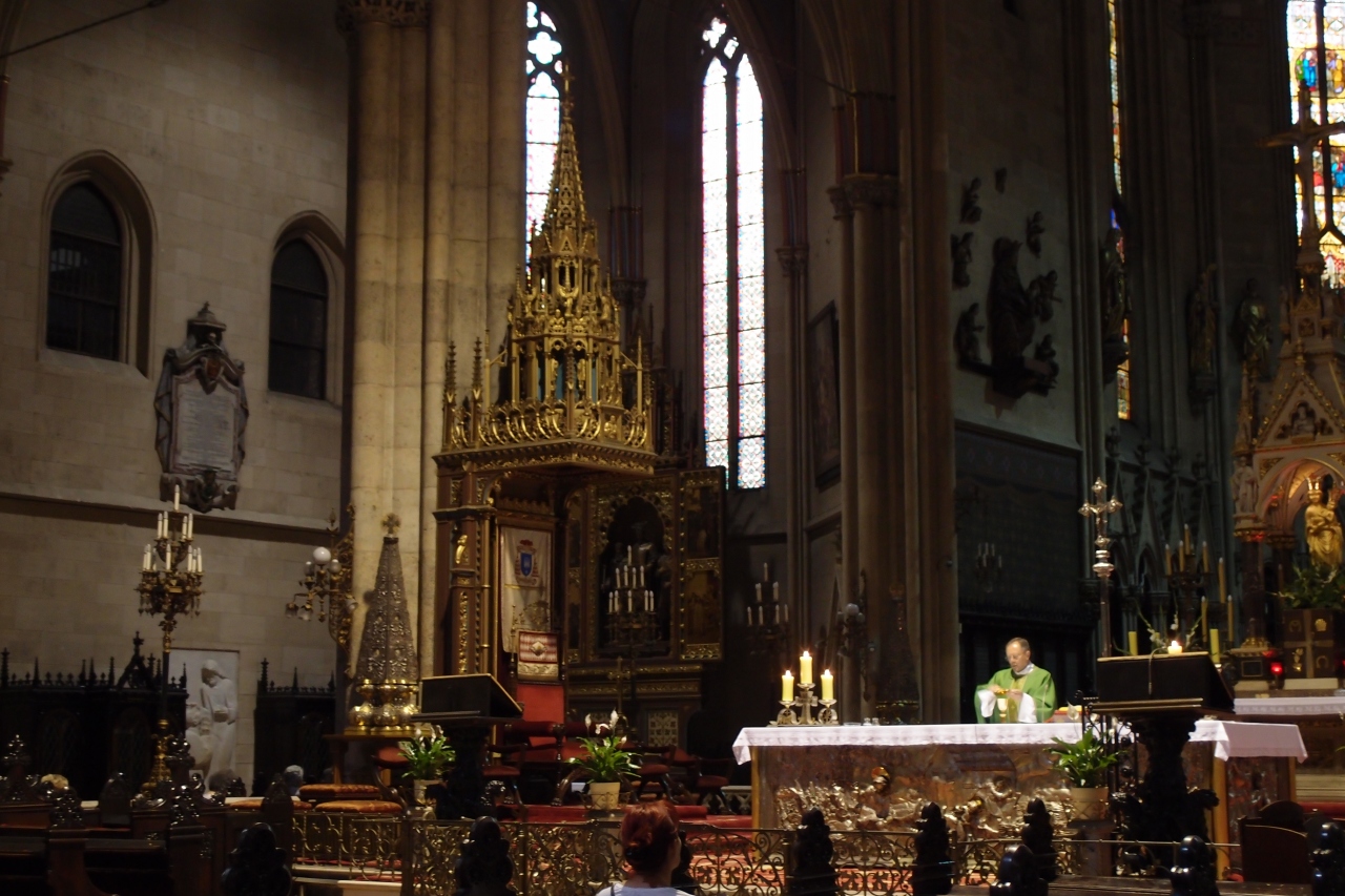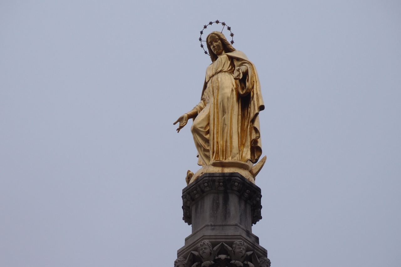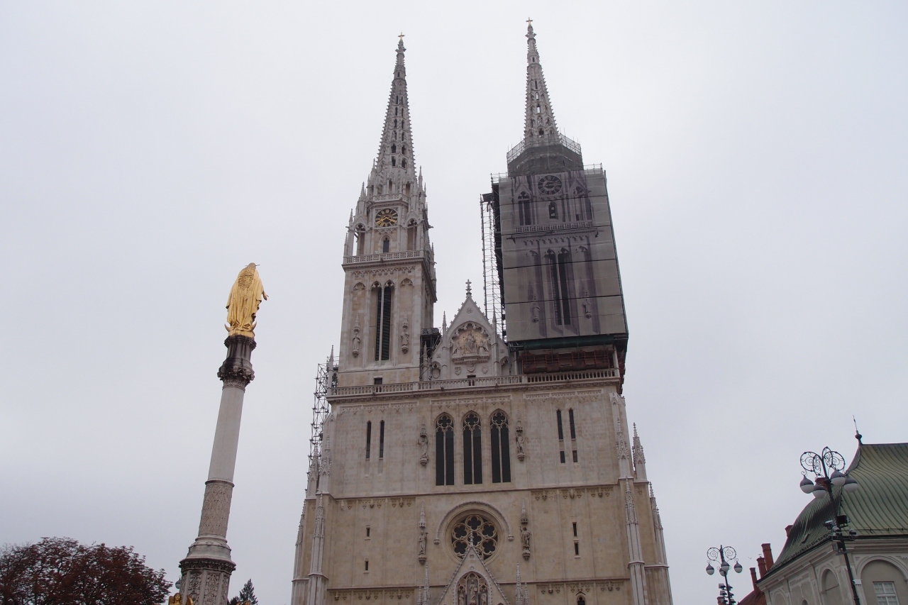 イェラチッチ総督広場の北東からカプトルの丘に向かって進むと大聖堂があります。塔の高さは105mあるそうです。大聖堂前のカプトル広場には聖母マリア像がありました。朝早くだったのでミサを行っていましたが、大聖堂の中に入ることができました。