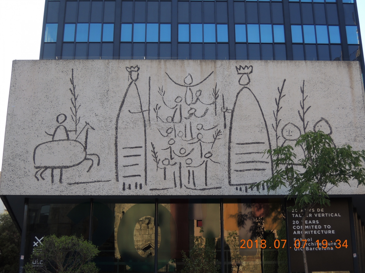 ゴシック地区の徒歩観光に参加したときに、「あちらはピカソの絵です。」とガイドさんが指さしました。帰国してから調べたら「カタルーニャ地方およびバレアレス諸島建築家協会」の壁画だということがわかりました。生き生きと表現された絵画はピカソが少年時代に祭りの時に繰り出される巨大人形やカタルーニャ地方の民族舞踊サルダーナを見たときの気持ちがそのまま表れているとの事です。