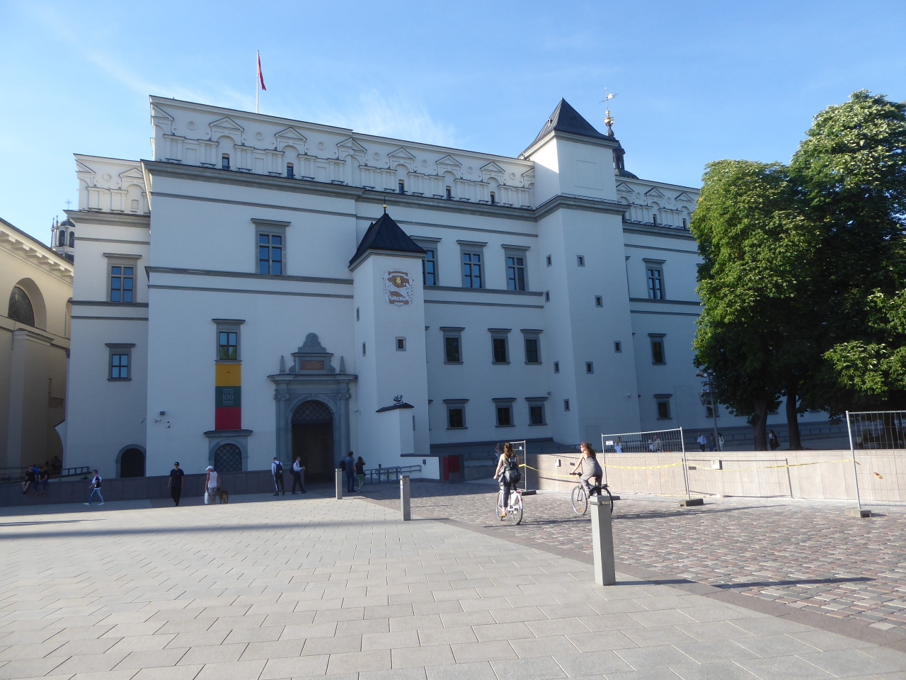 大聖堂広場には、中心部にリトアニアの英雄像が立ち、広場北側に大聖堂と鐘楼があります。大聖堂の東側に屋上に旗が掲げられている比較的新しそうな建物があったので、近くまで行ってみました。王宮(Palace of the Grand Dukes of Lithuania)でした。