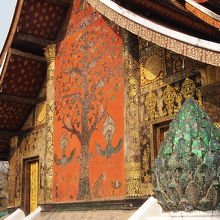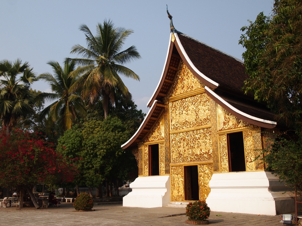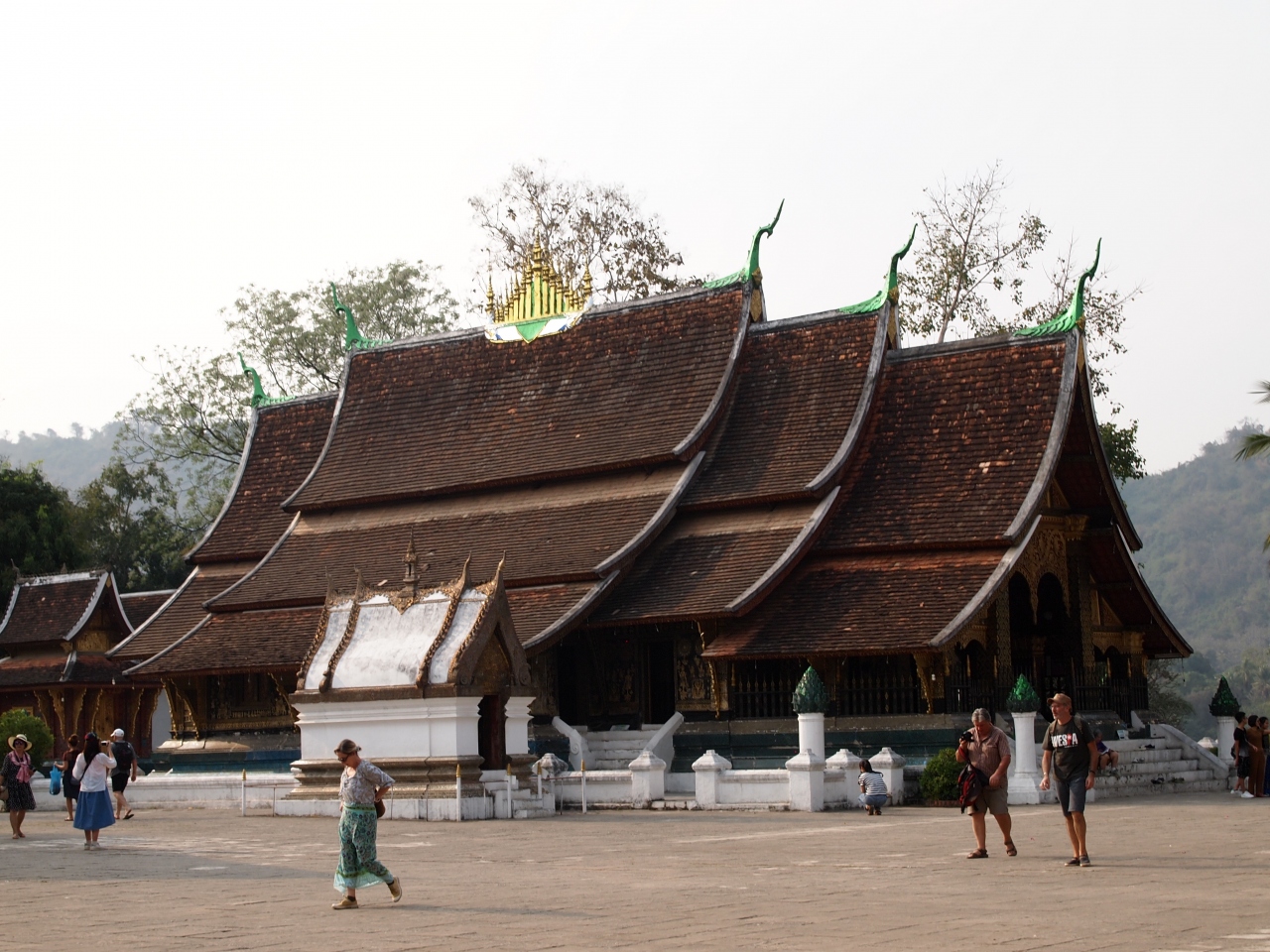 古都ルアンパバーン、ひいてはラオスを代表する壮麗な寺院です。街の中心部からは東の端っこまで少々距離はありますが、徒歩圏です。ラオス屈指の観光地でありながらここももちろん現役の祈りの場。日の高くて暑さ厳しい時間帯は、地元の人も観光客も朝夕に比べれば少ないのでゆっくり巡れます。独特な屋根の様式や緻密なモザイク画など、決して広くはない境内に細かな見所がたくさんあります。