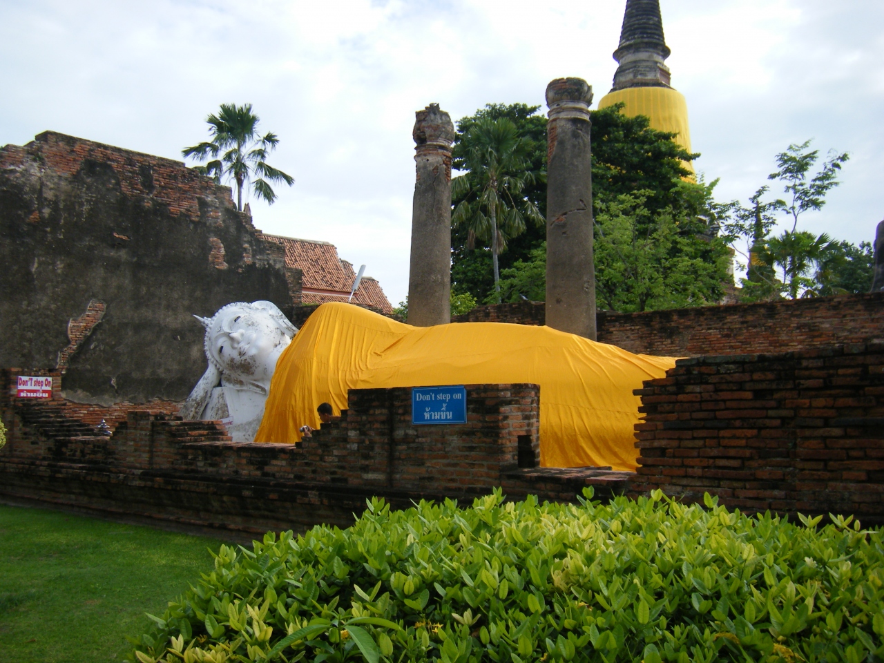 アユタヤにある有名な寺院ワット ヤイ チャイ モンコンは創建1357年の歴史のある寺院で、境内には涅槃仏がありました。ワットポーやワット ローカヤースッター のような大きさではありませんが、黄色の袈裟をかけられた涅槃仏はとても美しく、神々しい雰囲気を醸し出していました。やはりタイの仏様には黄色がとても似合いますね。やや小ぶりではありましたが、一番きれいに見えました。ワット ヤイ チャイ モンコンを訪問された方はぜひ探してみてください。