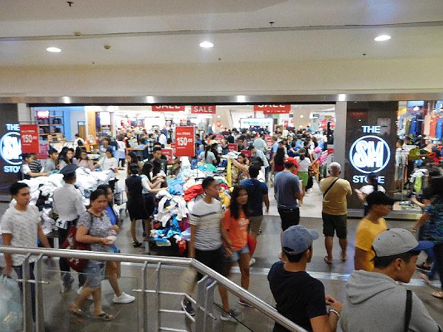 巨大なsmには、買い物客やレストランを利用した人たちがいっぱいです。