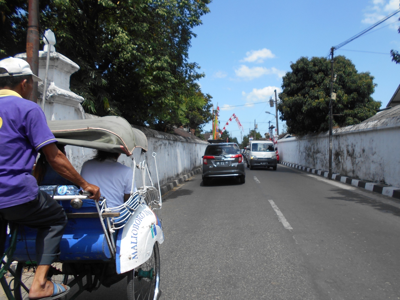 ジョグジャカルタを象徴する乗り物で,要は自転車タクシーです。だいたい1~2km以内を移動するのに適しており,料金は1万~2万ルピア程度。事前に交渉は必要ですが,それほどぼってくるわけでもなく使いやすいです。インドネシアは日差しは強いですが,湿気がさほどではないので幌があるだけで途端に涼しくなります。頑張ってもらったらチップをはずみましょう。