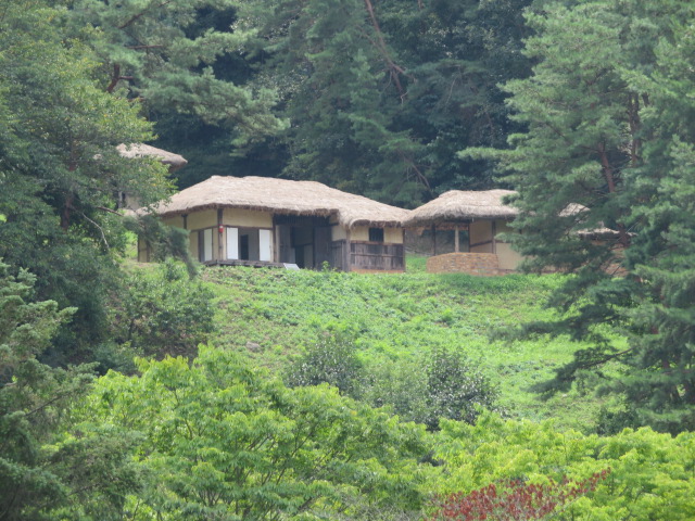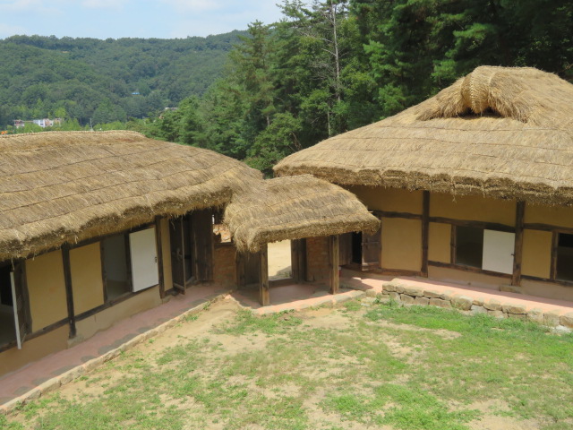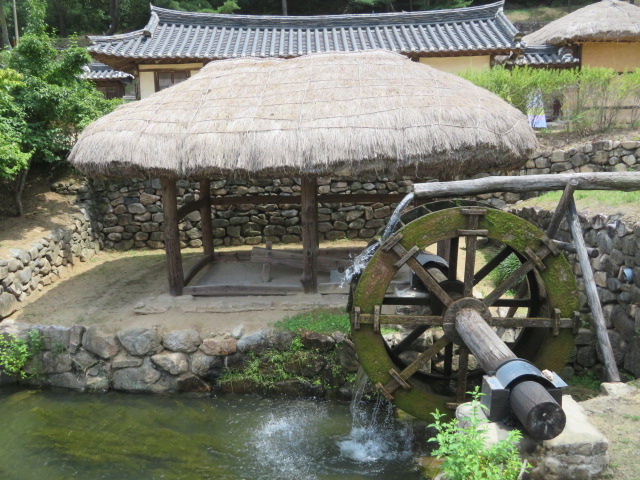 野外には民俗村があり、登坂沿いに茅葺屋根など古い建物が並んでいて見ながら歩くことが出来ました、石垣や水車もありました。