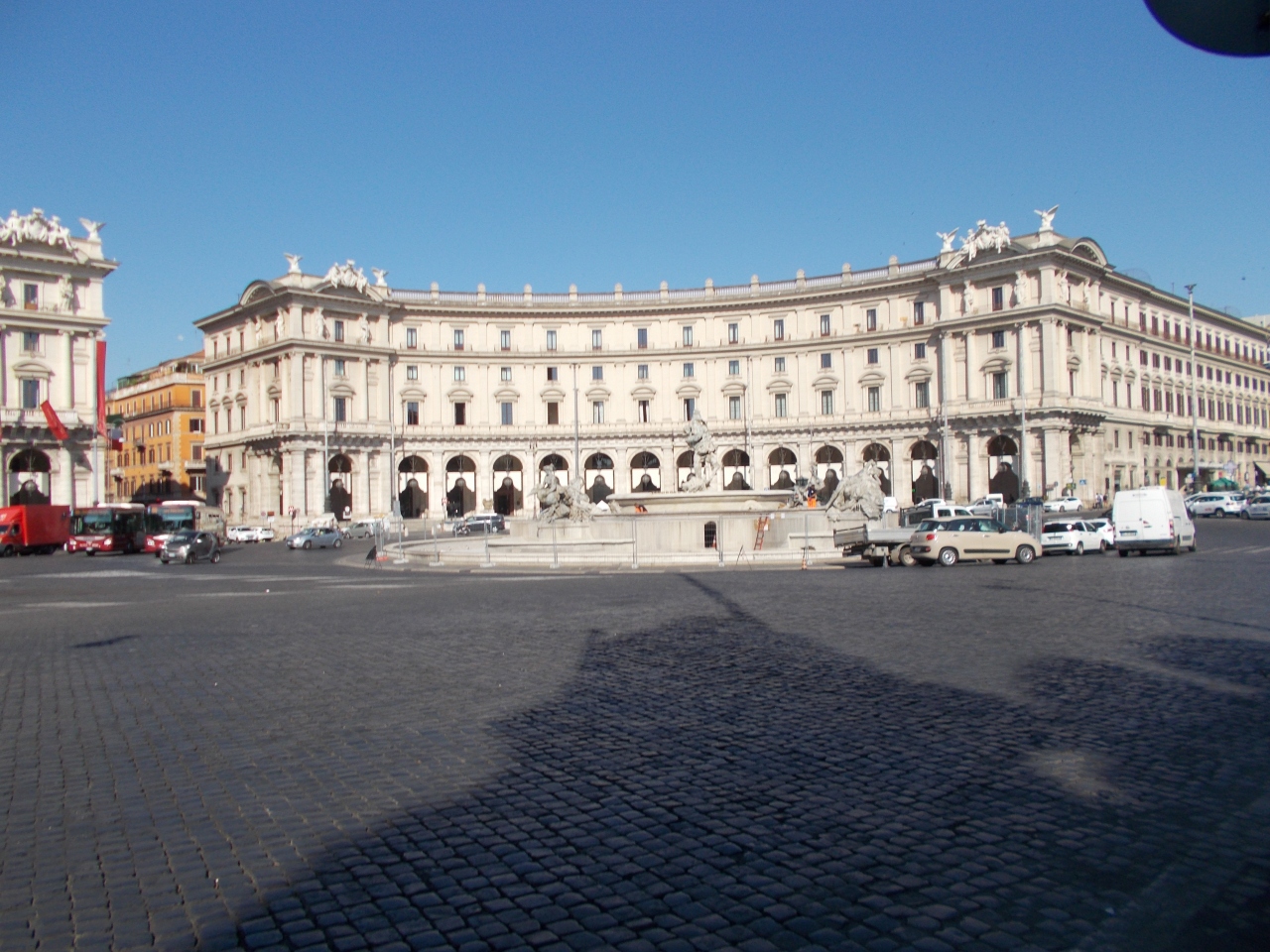 この共和国広場はテルミニ駅前の五百人広場からさらに西にあります。広場は円形でその円形に合わせて建物も合わせて囲んでいます。広場の中央には石像の妖精が飾られています。「ナイアディの噴水」です。ただこの広場を車が走っていて近づくのに気を使います。