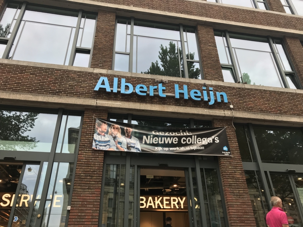 夕方?(サマータイムは9pmでも明るいので)7pmで店がドンドン閉まっていき、コンビニも殆どないアムステルダム中心、夜10pm位まで営業しており、酒、惣菜、チーズ、パン、サラダなど品揃え豊富なスーパーです。8pmごろ行くと、見切り品のディスカウント品もあり、非常に助かります。