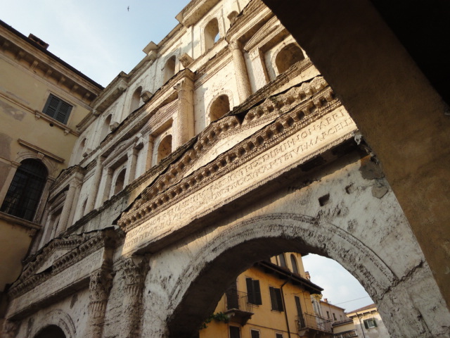 ヴェローナにあるボルサーリ門です。門の両側の建物は、割と現代風になっていて古さがなく、ファサード部分だけが挟まっているようなかんじに見えました。南側は、表なのかアーチの上に2層だてとなった窓のような部分など、細かく作ってありますが、北側から見ると、なかなか簡素になっています。表は、ローマ神殿風というかで、素敵です。