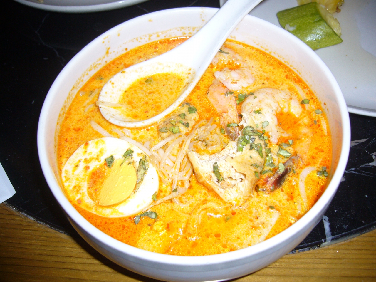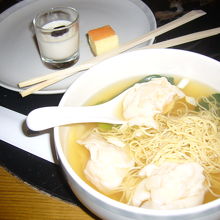 サンドイッチ、クッキー、アイスクリーム、ミニケーキ、サラダ、シューマイ、一口ステーキ等色々ありますが、ワンタンメン、ラクレが注文できます。スタッフに頼むと番号札を渡され、テーブルに置いておきます。出来上がりを持って来てくれます。ワンタンメンを注文しました。私には塩味が強いですが、ワンタンにはぷりぷりエビがたっぷり入っていました。砂糖かけ豆腐は自分で取り分けて食べます。今度はラクレも注文。平米麺で辛味が癖になりそうでした。最後の香港料理を楽しめました。お皿の回収も早いので、綺麗です。