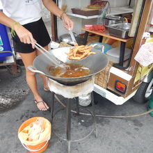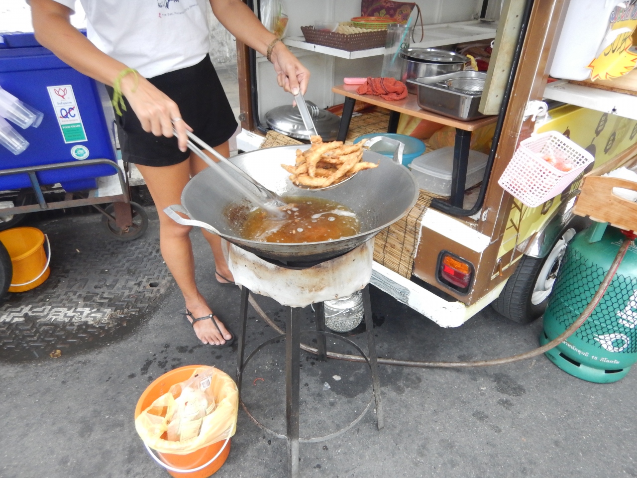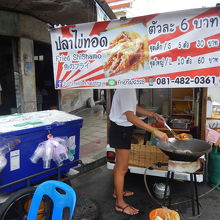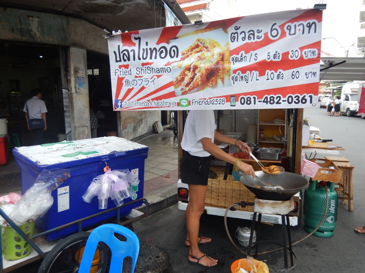 最近ではサムセン通りの近くの宿によく泊まる。昼間はマッサージ店やゲストハウスが目立つ程度。夜になると屋台が多少営業を始め、レストランやバーも開く。今回は夕方バンランプー運河から北へ歩いてみた。フライドフィッシュの屋台が「fried Sisyamo 魚のフライ」と書いてあったのが興味深かった。買って食べてみればよかったと今は思う。