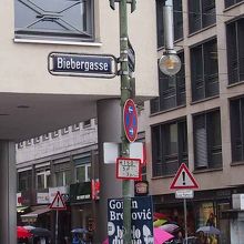ビーバーガッセ通り(Biebergasse)通りは地下鉄 Frankfurt (Main) Hauptwache駅に程近いショッピングストリートです。通りは歩道が広いですが自転車が数多く駐輪されていて歩き辛いです。歴史を感じるような街並みではありません。