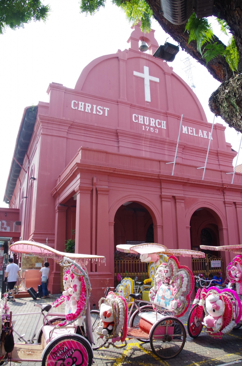 周りがエンジ色の建物のオランダ広場の中に、キリスト教会があります。中に入ることができます。正面には、宗教画が飾られています。また、ステンドグラスもあり、外からの光できれいに教会内にも、色々な色の光りがきれいに照らされていました。