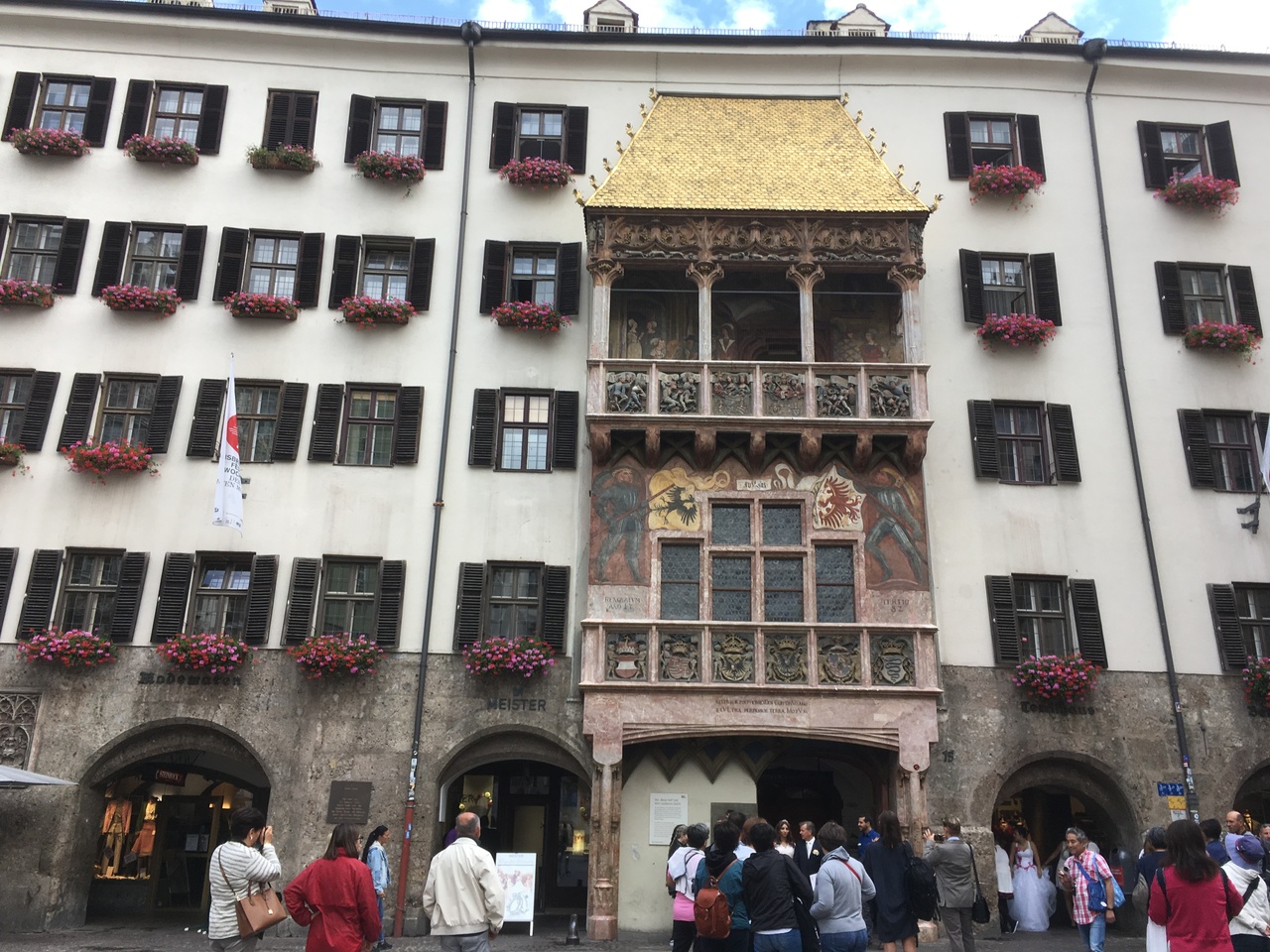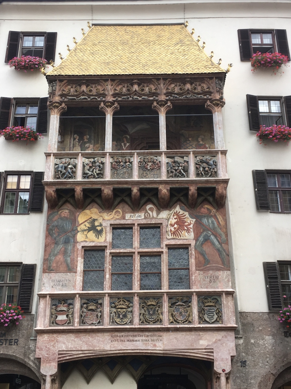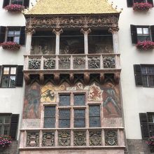 インスブルクのランドマークの一つ「黄金の小屋根」です。神聖ローマ皇帝マキシミリアン1世が、旧市街で行われる祭りやイベントを見物するため、最もよく見える場所に建っていた5階建ての建物を改装させ、観覧席をくっ付け、ロイヤルボックスにしてしまったというシロモノです。バルコニーの屋根に2657枚の金箔が貼りつめられていることから、「黄金の小屋根」と呼ばれています。クリスマス時期になると、ここの前の広場がクリスマスマーケット会場となります。にこの季節に訪れる観光客を楽しませています。建物内部は博物館となっていて、入場も可能です。