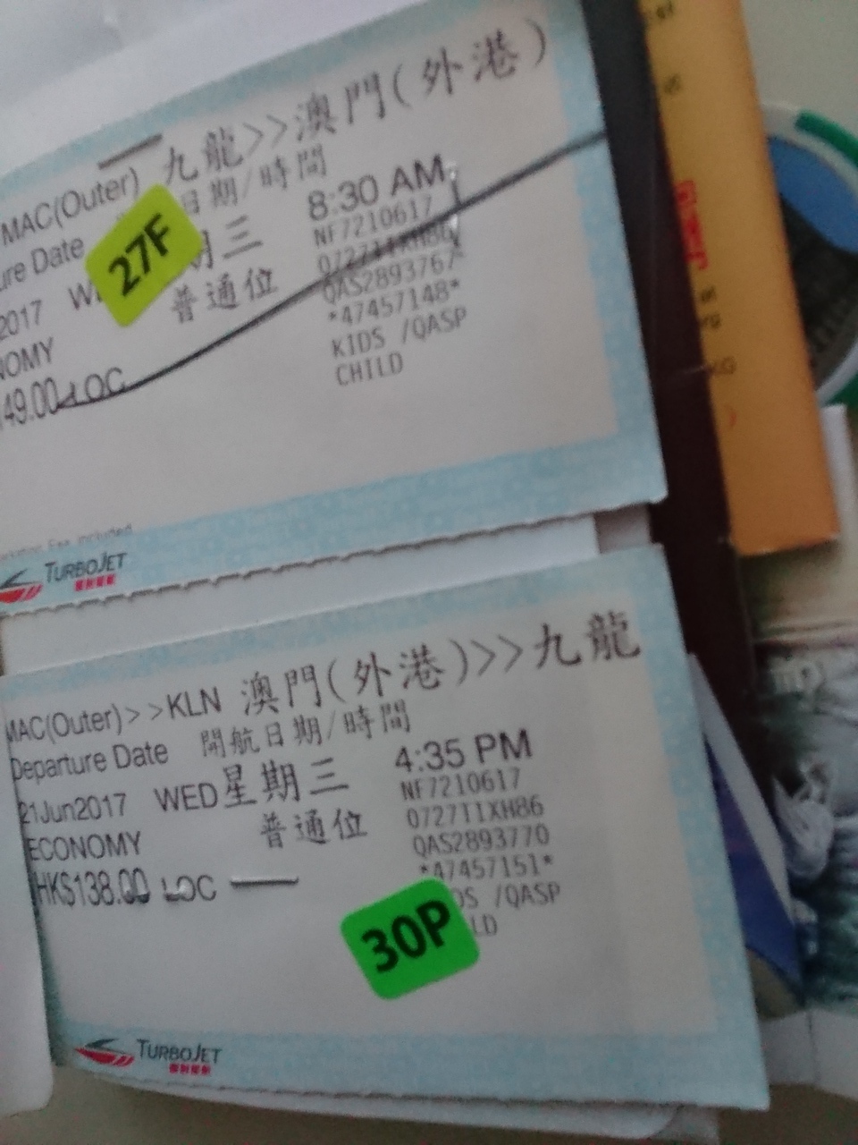 無理して香港、マカオ両方観光しなくてもよかったかも。ターボジェットめちゃくちゃ揺れが激しくて怖い!大人でも怖いのだから、子どもは当然泣く。私以外にも子ども連れはたくさんいたけど、どの子も泣いていた。中には吐いてしまう子も。酔い止めを飲んでから乗ったけど、それでも私は酔いました。