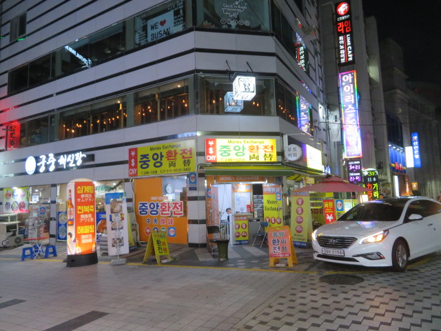 南浦洞にある両替所です、利用したことがある釜山観光ホテルなどの宿泊施設、飲食店、コンビニが並んでいる地区です、ここは何軒も両替所も並んでいますので何処も両替率がいいですが微妙に違いがある時があります、今回は他と同じでしたので中央両替所でしました、日本語対応です、いつも空港よりいいのでここで替えることが多いです