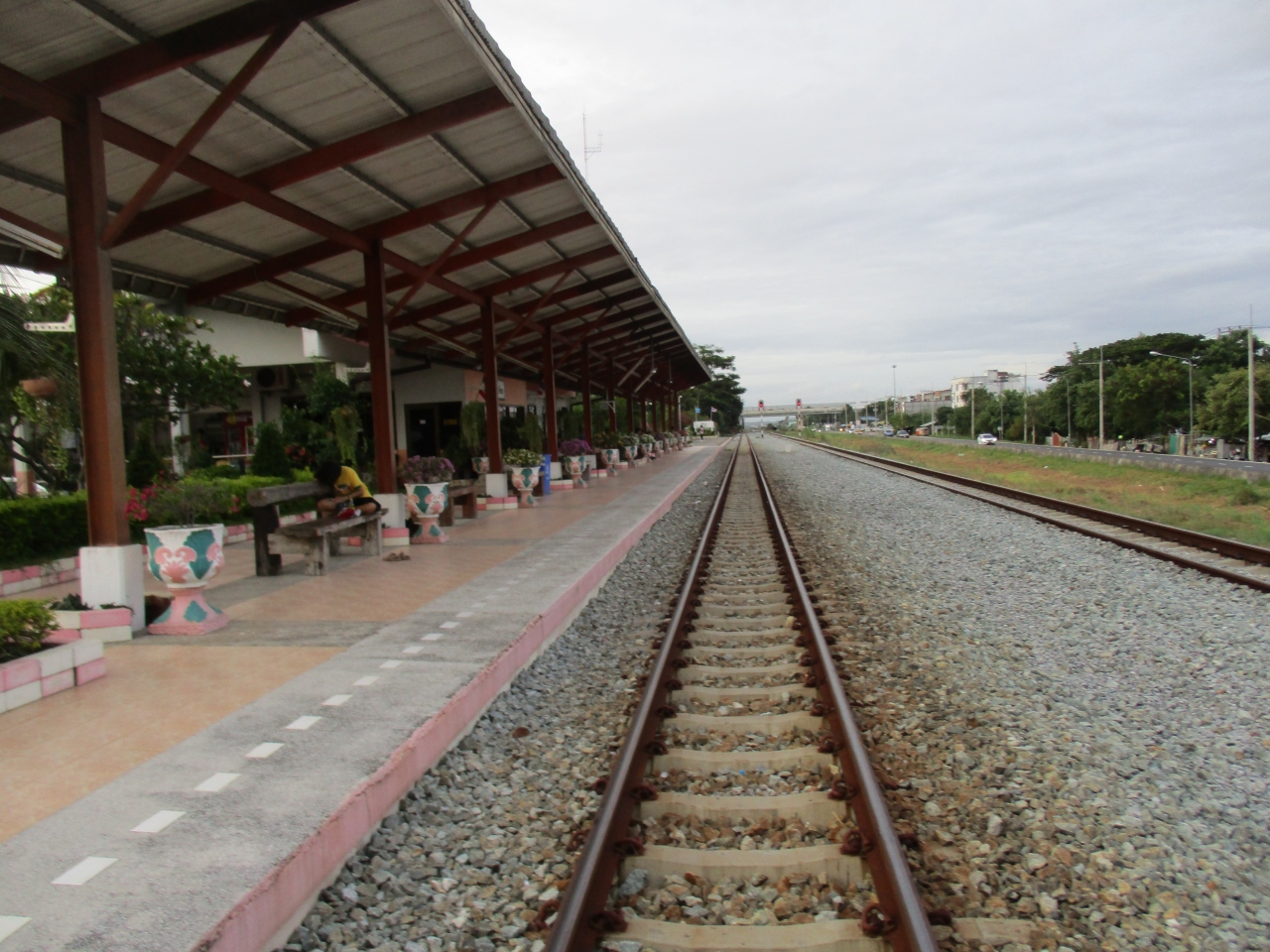 パタヤ駅はスクムビット通りの東側にありました。駅はシンプルな構造でしたが、プラットフォームは長く20両編成くらいの電車は駐機できそうです。改札はなく自由にプラットフォームに出入りでき、線路に降りることもできました。列車がしばらく来なさそうだったので、線路に降りて記念撮影してみました。