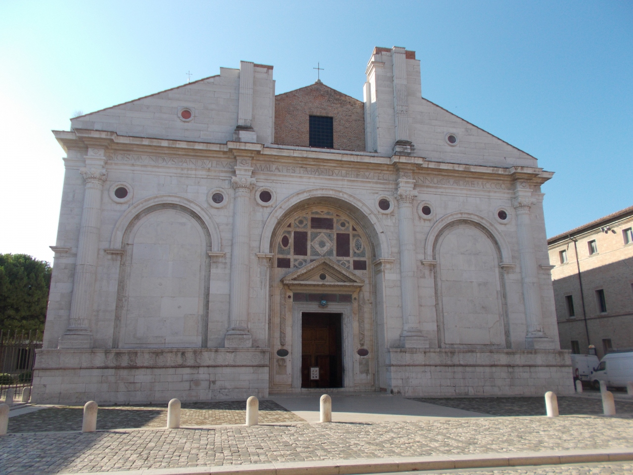 このマラテスタ神殿は聖堂です。マラテスト広場の一角にあります。教会というよりも古代の聖堂の印象が強いです。内部は公開されています。内部も魅力的で時間を止めてみています。特にイエスを抱いたマリアのモザイクと彫刻が印象的です。