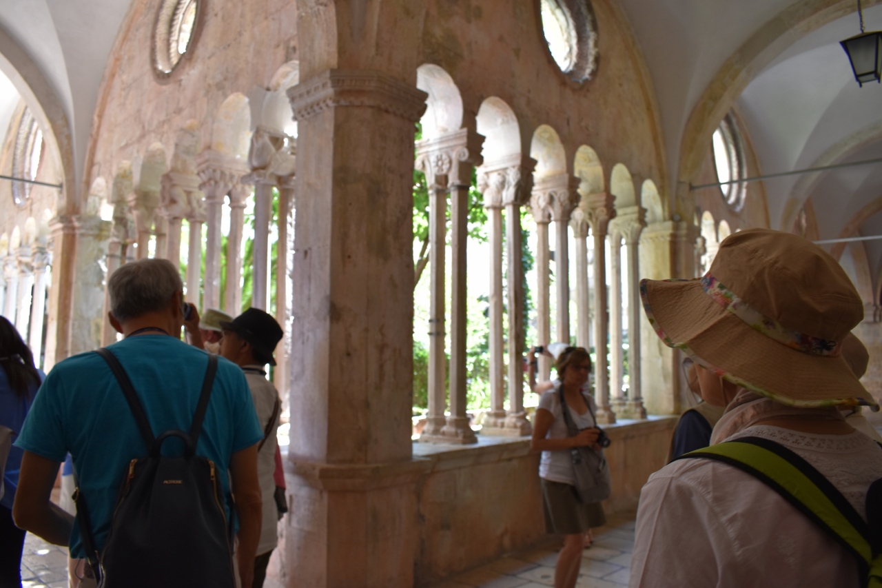 ピレ門をくぐってすぐ左側にある大きな修道院。入り口は狭く、たくさんの観光客が出入りするため混雑していた。14世紀に建てられたというロマネスク調の回廊が美しい。中庭は1667年の地震の影響が少ないそうである。