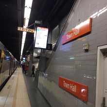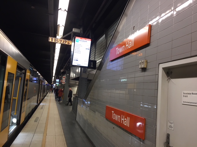 シドニーの中央駅のセントラル駅から地下鉄で1駅目です。駅名のタウン ホール以外にクイーンビクトリアビルディングやハイドパークにもアクセスできるので、非常に使い勝手の良い駅です。シドニーの中で一番賑やかな駅ではないでしょうか。