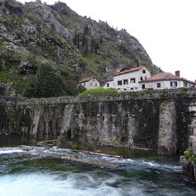 北門に架かる橋からは綺麗な川と城壁がへばりつく絶壁の山