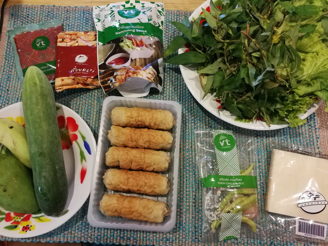 ベトナムから伝わった、竹輪のように、豚肉の練り物を串に巻き付けて焼いたものを小さく切って、ハーブやニンニクなどといっしょにレタスやライスペーパーで巻いて食べる料理です。