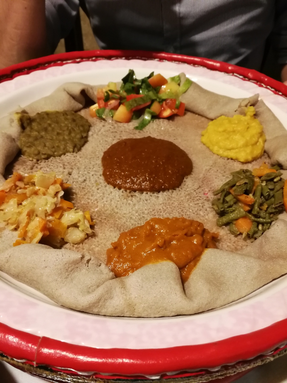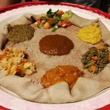 クレープのようなインジェラは野菜やカレーのペーストなどといっしょに食べます。酸味が強く、好き嫌いが分かれる味です。