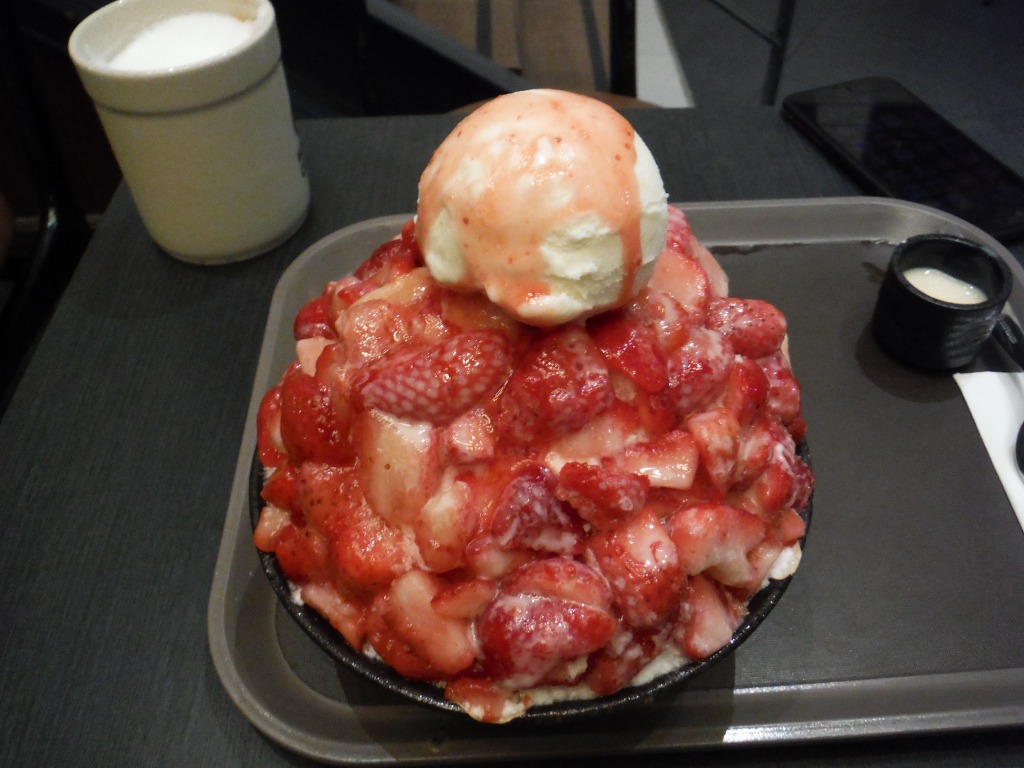 深夜に酔いざましのコーヒーを飲みに。 友人はフルーツが山盛りになっている写真につられて、かき氷を頼んでいました。 店内はエアコンでガンガンに冷えていて、とてもかき氷を食べられる室温ではなかったので、テラス席に移って食べました。