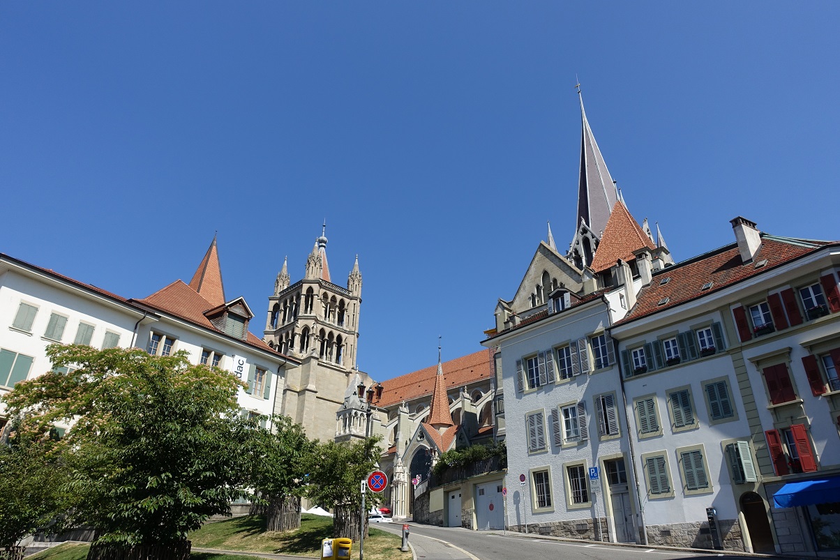 ローザンヌの坂の上、旧市街の一角にこの大聖堂があります。坂の上側から降りてくると突然大聖堂が現れ、全景を写真に収めることができませんでしたが、大聖堂の見学を終えて坂を下ると、大聖堂をきれいに見上げられる広場がありました。