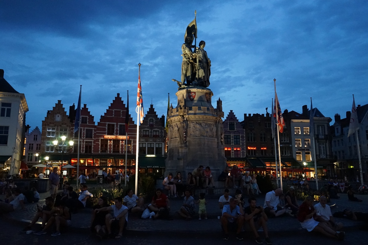 ブルージュのマルクト広場の中央に立っている銅像です。14世紀初めにフランスから侵略から守り抜いたヤン・ブライデルとピーター・デ・コーニンクというフランダース地方の英雄だそうです。夜、ライトアップされた像は周りの景色もありいい雰囲気でした。