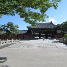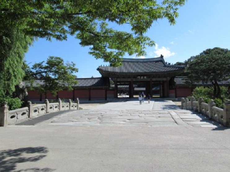 今日は世界遺産である昌徳宮を見学しますその正門である敦化門前でチケットを購入しま門を通って入ります。この敦化門はソウルにある宮殿で現存する最古の正門とのことで見ごたえがありますよ。そして真っ直ぐ歩きますが突き当りに世界遺産の碑が建っていてその右にこの「錦川橋」があります。この石橋は1411年に造られソウルに残る最古の石橋とのことで600年が経過し趣がありますね。また動物の形をした石造もが彫られ、川は流れていないものの底は石畳で出来ていて重厚感たっぷりです。奥に見える進善門へと歩きましょう国宝の仁政殿へはもうすぐです。